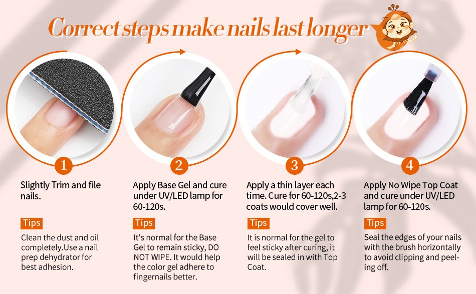 Step 3.Apply Base gel first,which can make polish lasting longer, cure with UV lamp or LED lamp. (Necessary)