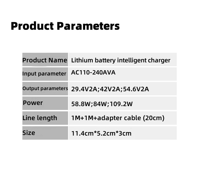 *Input: 100-240V 50/60Hz 2A(max); Output: 42V2A. For 36V 25.2V 25.9V 25.6V 24V Li-ion battery pack. Don’t use it for Lead Acid battery pack.
