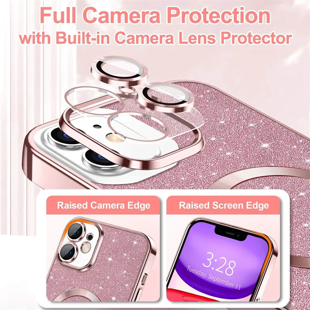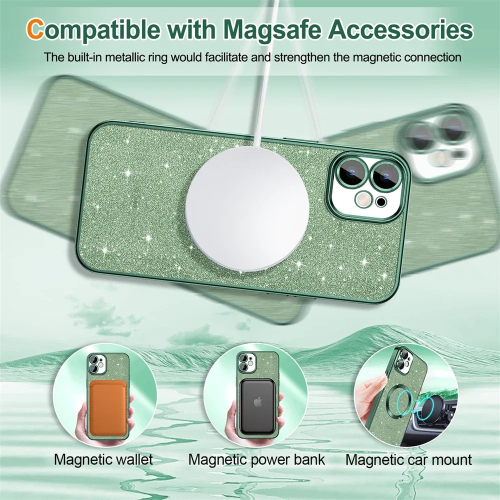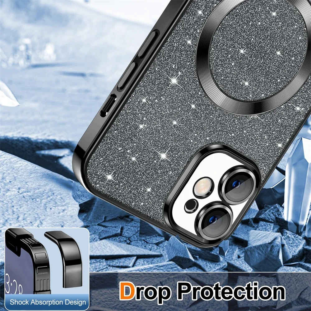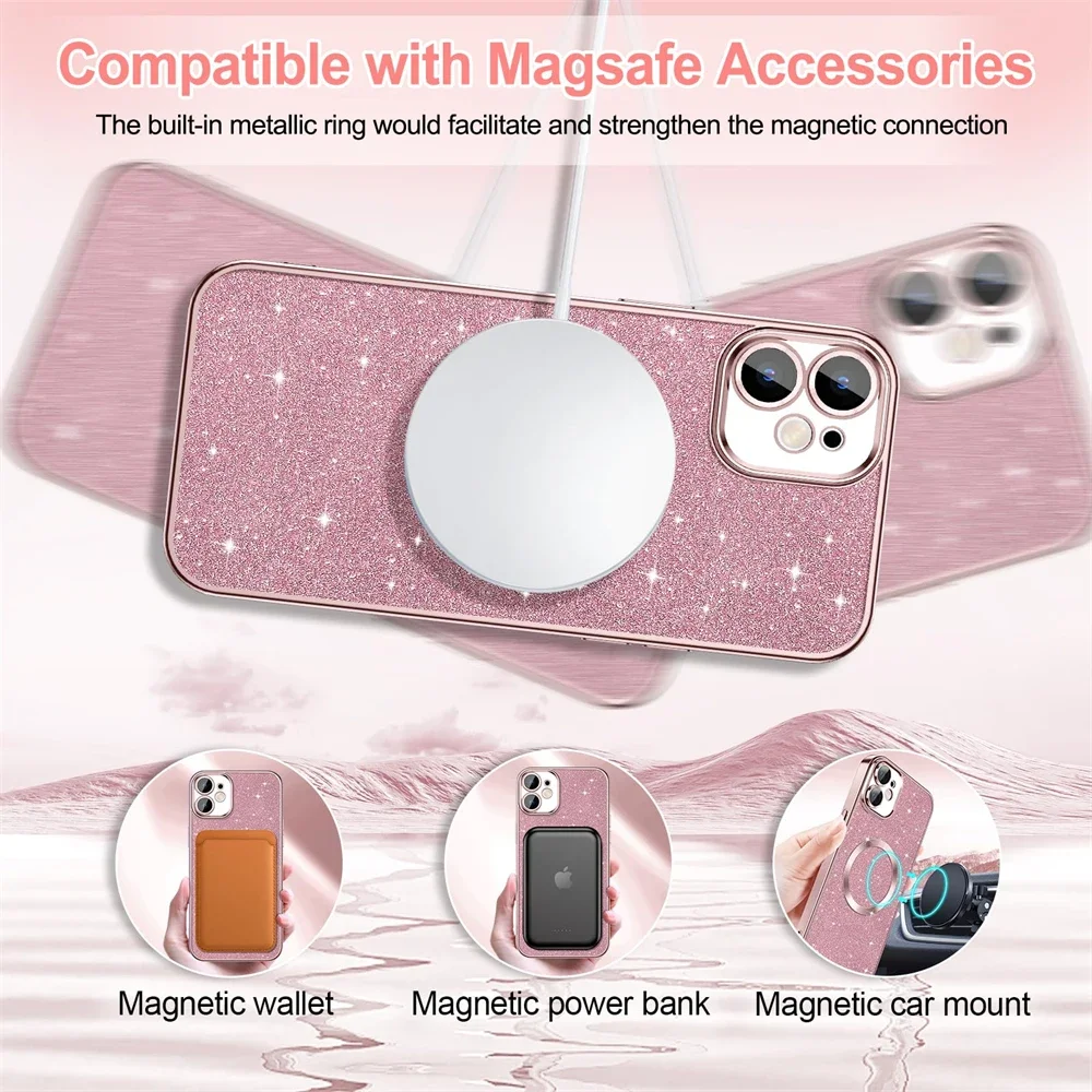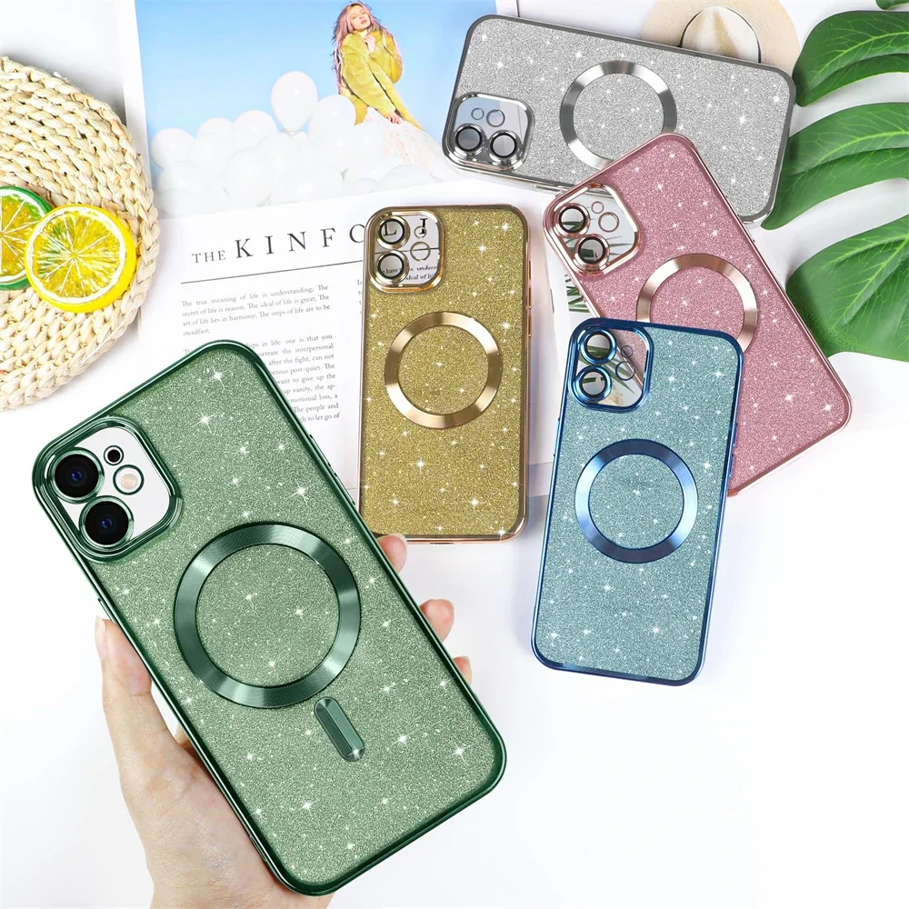 Electroplate With Lens Protector Case For iPhone 15 14 13 12 11 16 Pro Max Plus For Magsafe Wireless Charge Bumper Glitter Cover