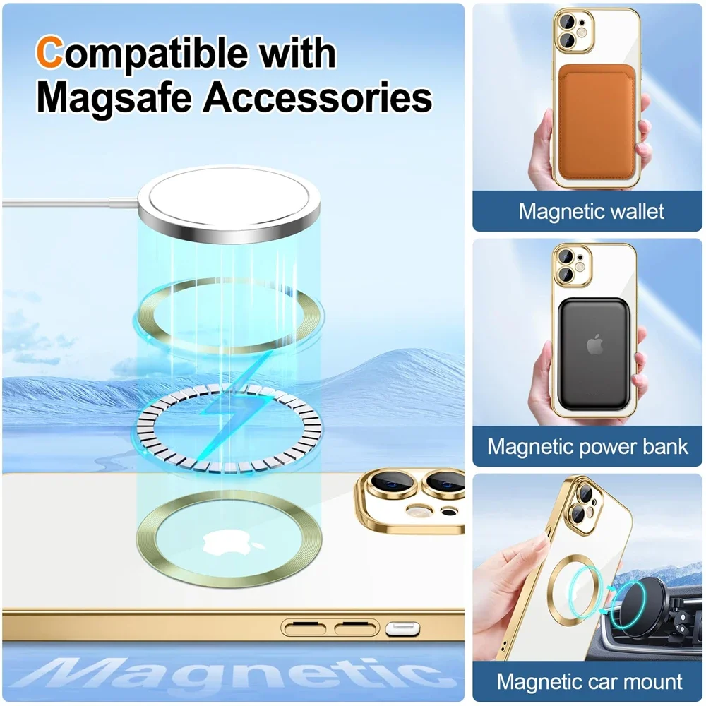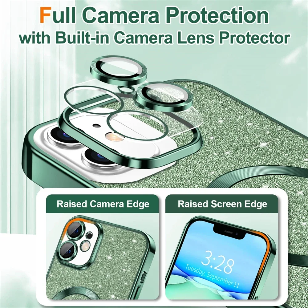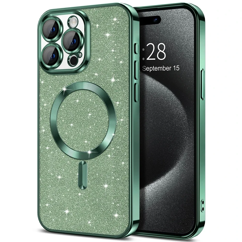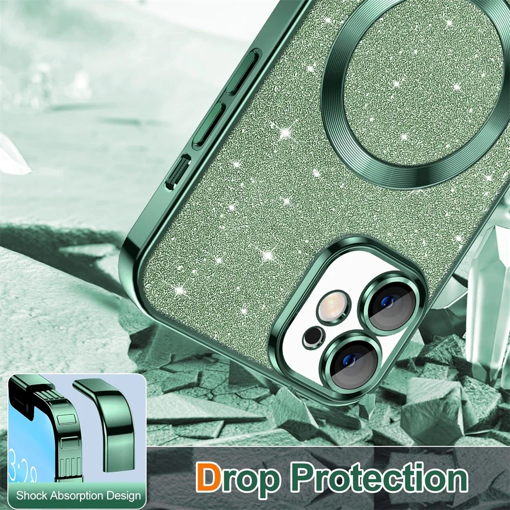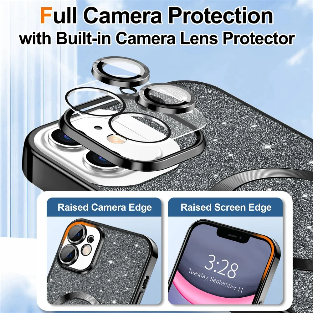 Electroplate With Lens Protector Case For iPhone 15 14 13 12 11 16 Pro Max Plus For Magsafe Wireless Charge Bumper Glitter Cover
