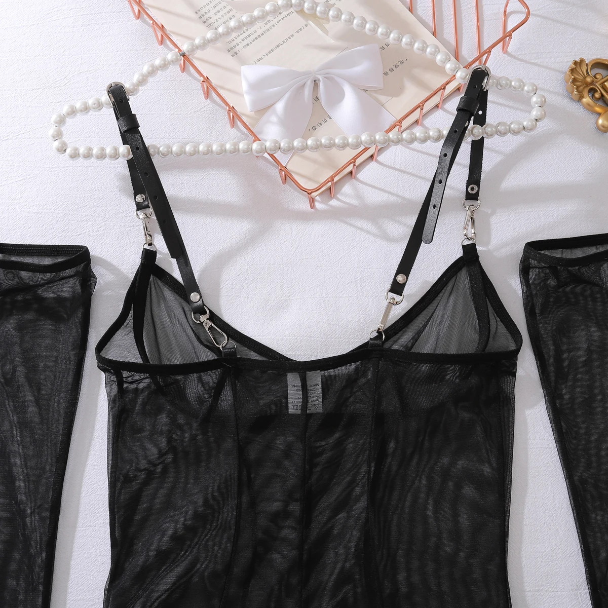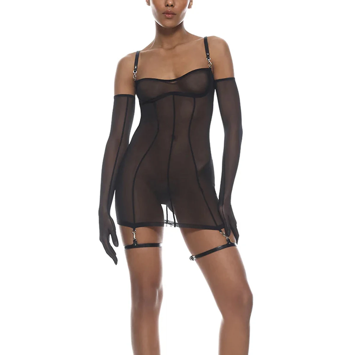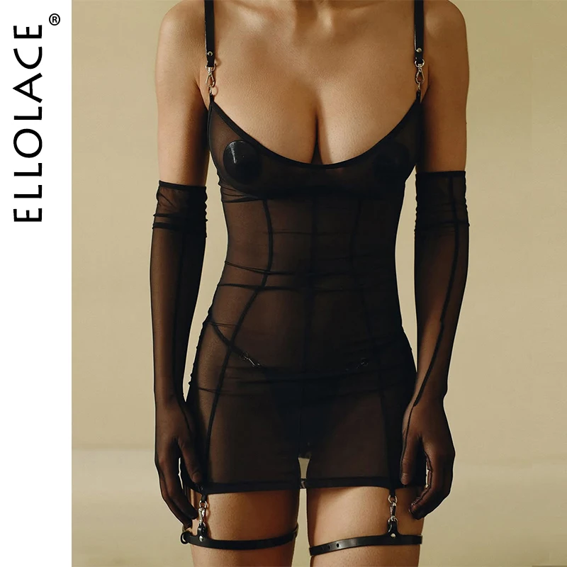 Ellolace Discipline Sexy Lingerie See Through Dress Thong 2PC Set with Gloves PU Leg Circles Harness Metal Fastener Party Kit