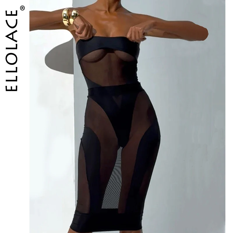 Ellolace Elegant Hot Sexy Lingerie See Through Strapless Bodysuit Half Dress 2PC Set Seductive Splicing Party Queen Costume