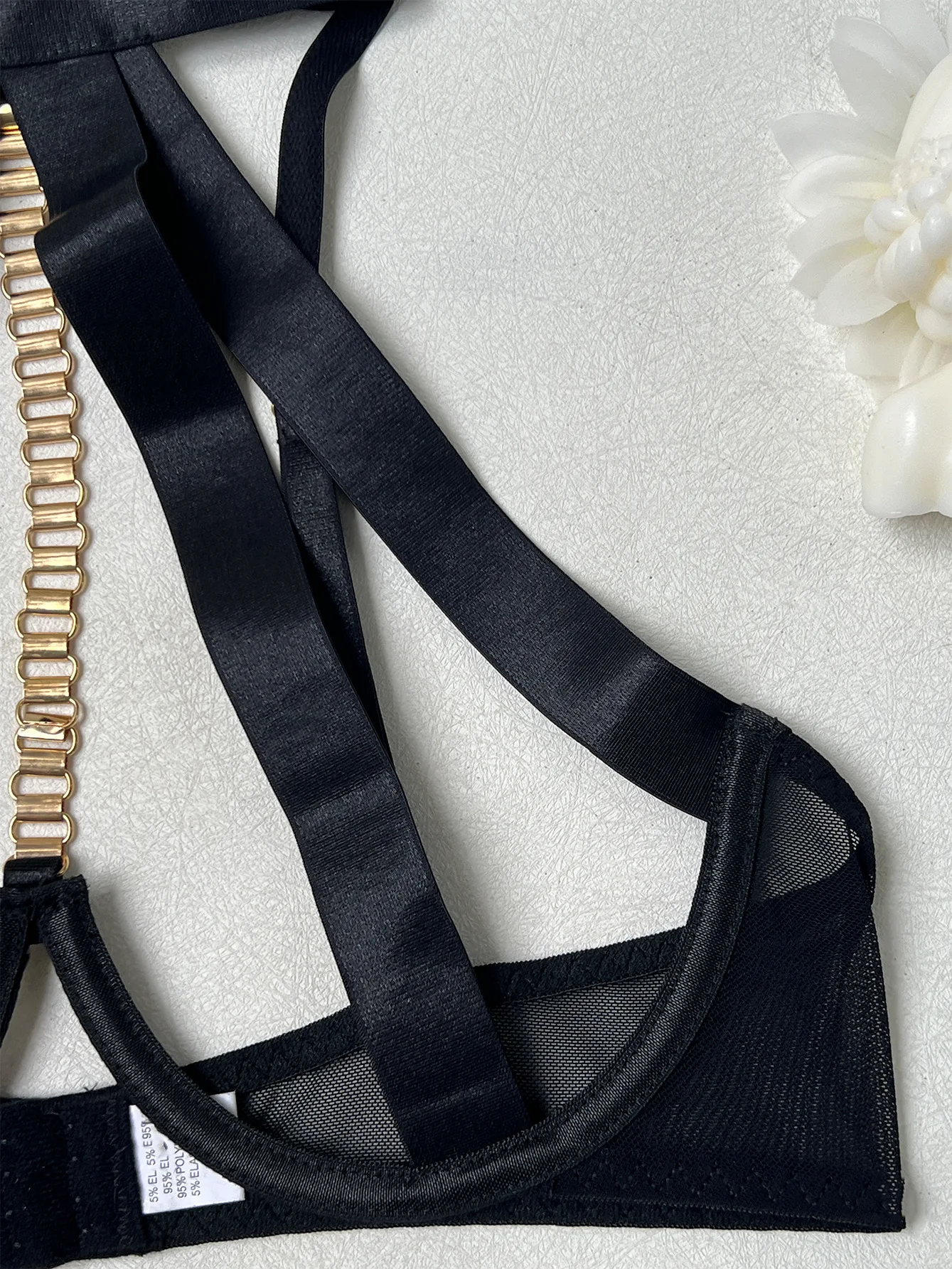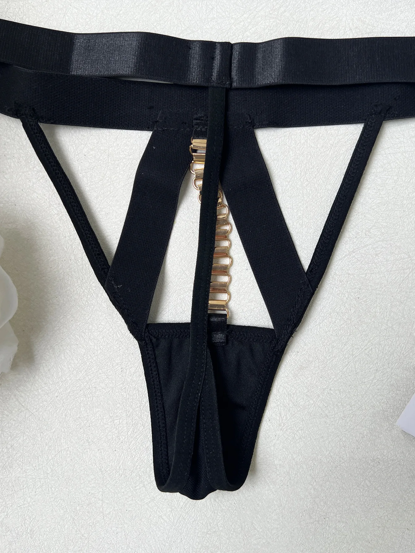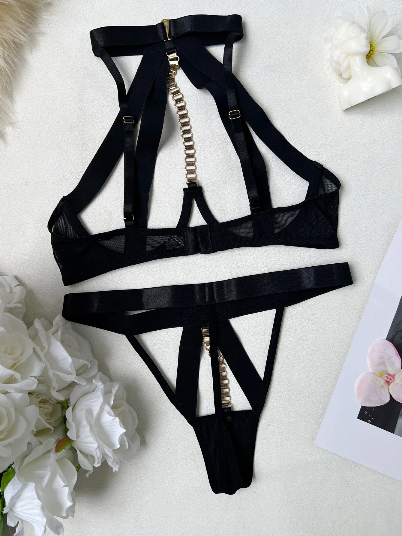 Ellolace Erotic Lingerie Sexy Women Seductive Bandage Halter Hollow Bra Thong 2PC Set Sissy Chain Decor Women’s Clubwear