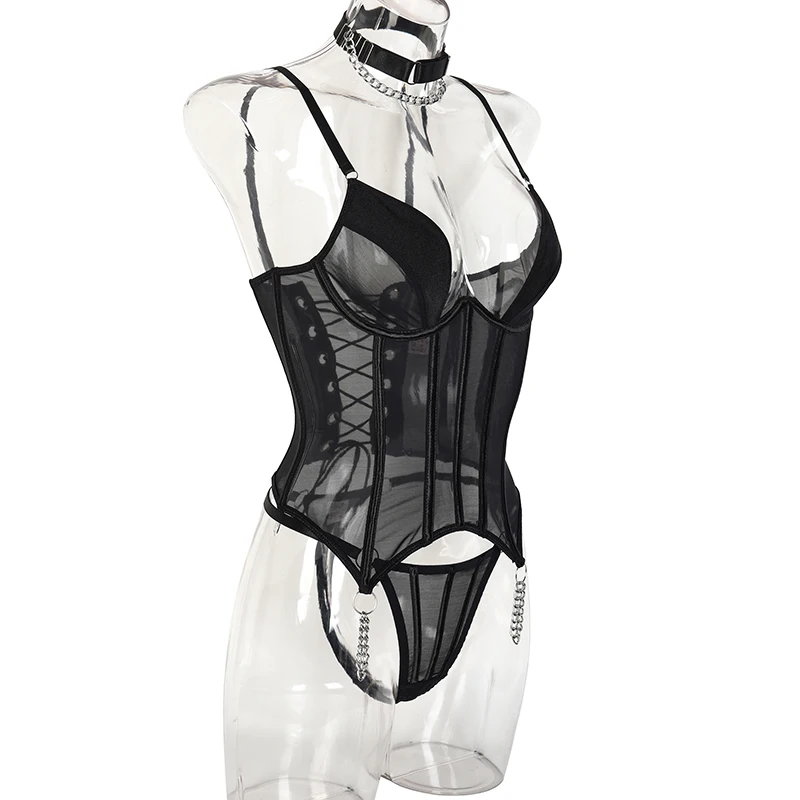 Ellolace Fancy Lingerie Backless Lace Up Corset Set Seamless Underwear 3-Piece Bra Kit Push Up Exotic Sets Black Fine Intimate