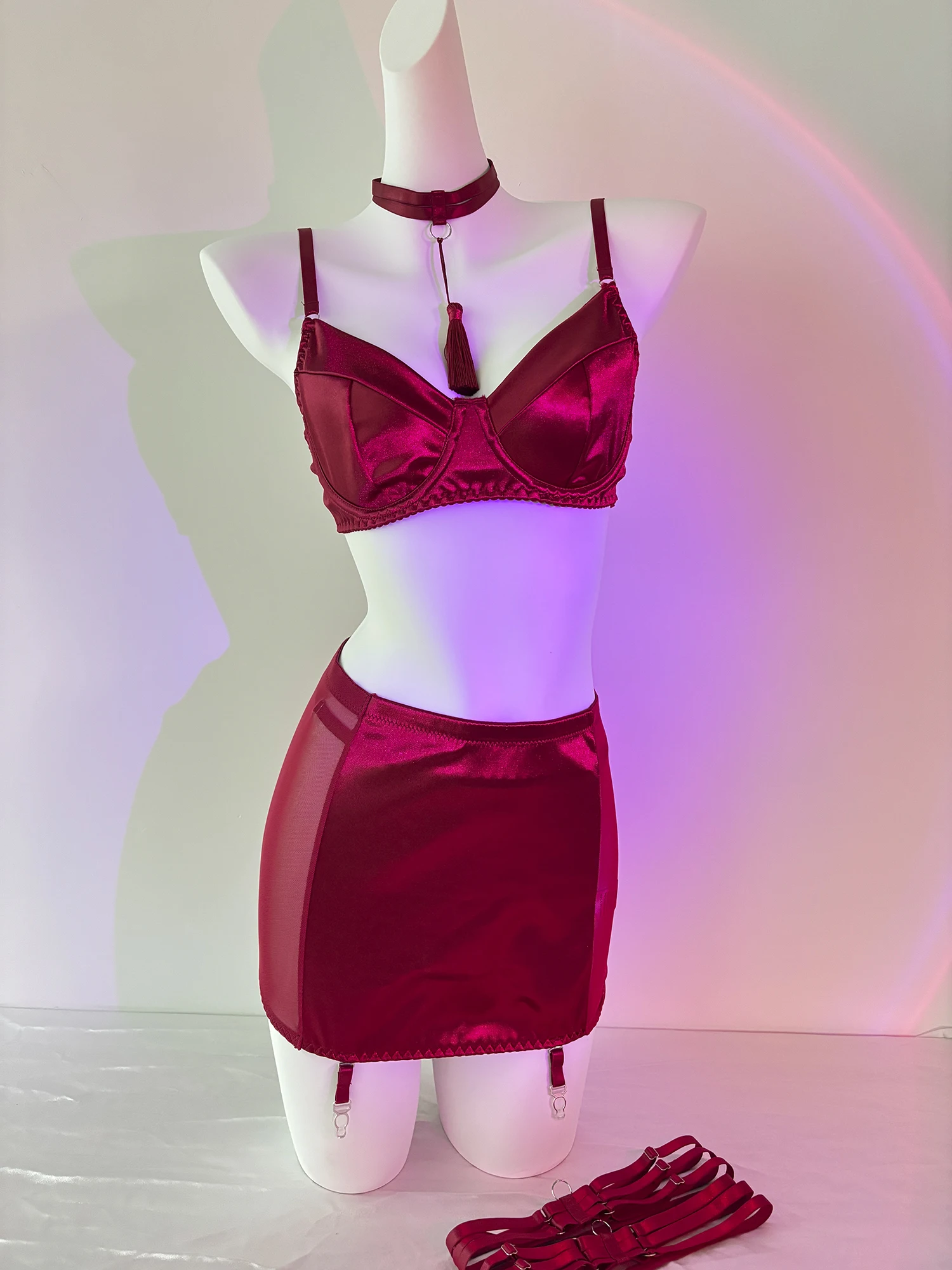 Ellolace Fine Satin Lingerie Sexy Underwear Lace 5-Piece Sissy Seamless Intimate Uncensored Skirt Fancy Bra And Panty Outfits