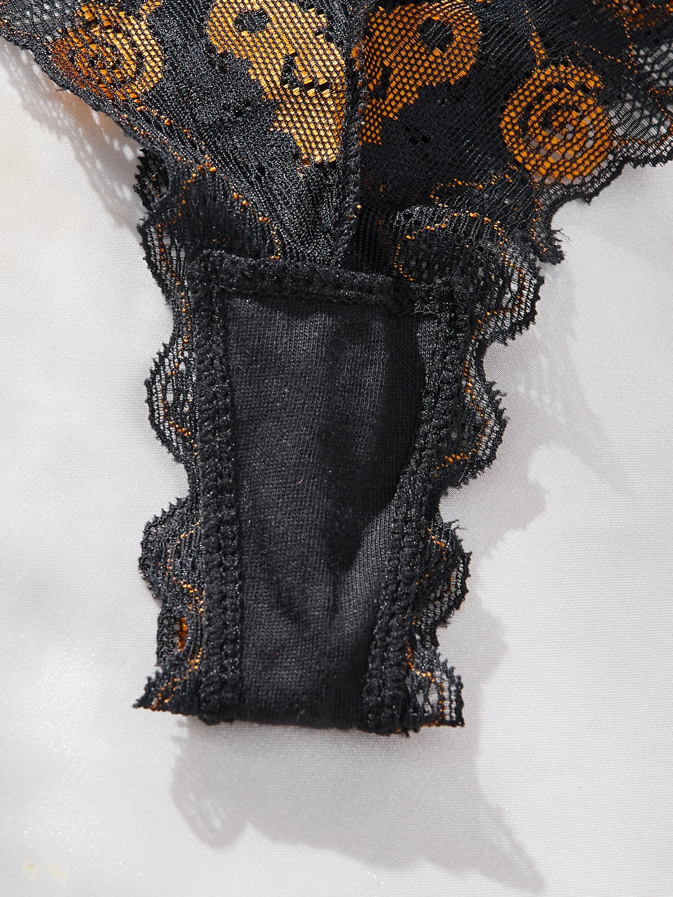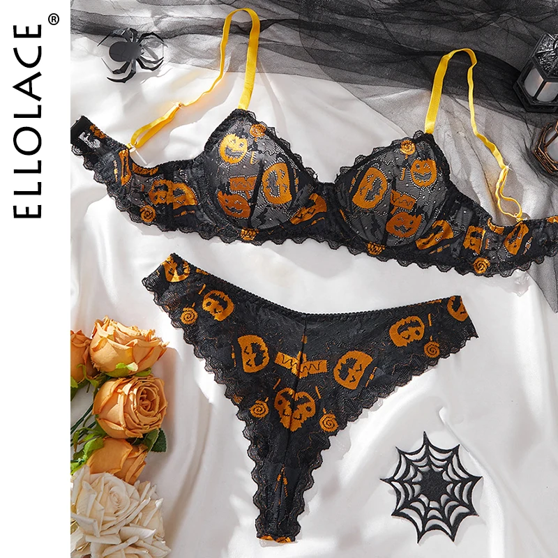 Ellolace Halloween Lingeries Sexy Hot Exclusive Pumpkin Lamp Wacky Faces 2PC Set Witty Treat and Trick Cosplay Women’s Underwear