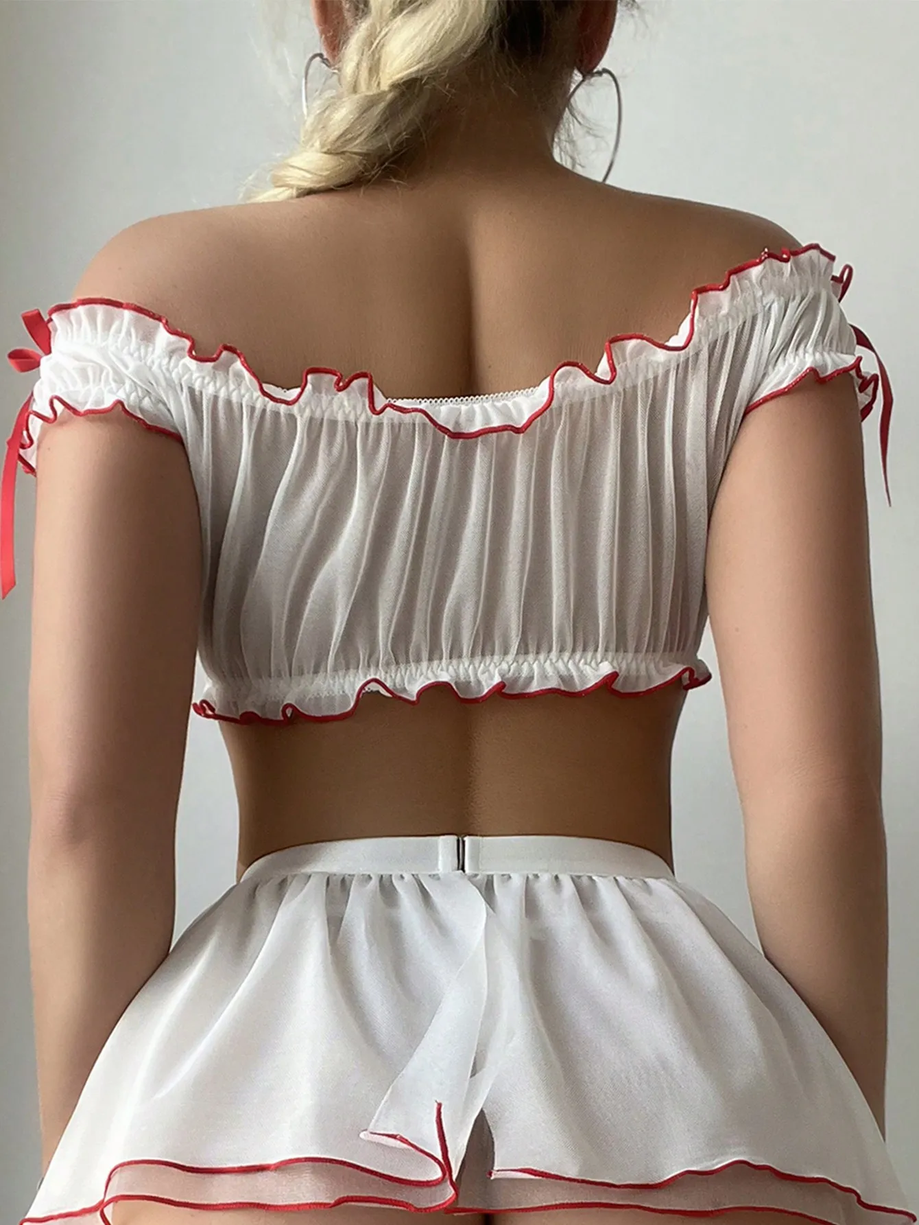 Ellolace Nurse Cosplay Sexy Set Lingerie Ruffles Off Shoulder Erotic Role Play Outfit See Through Tulle Ensemble Lingeries