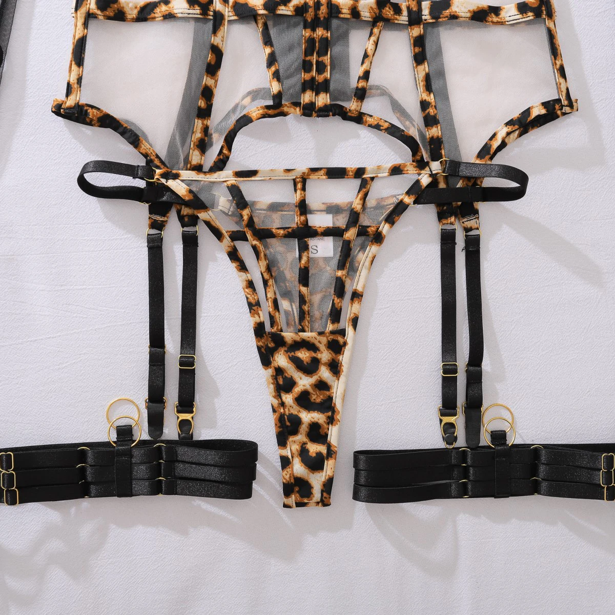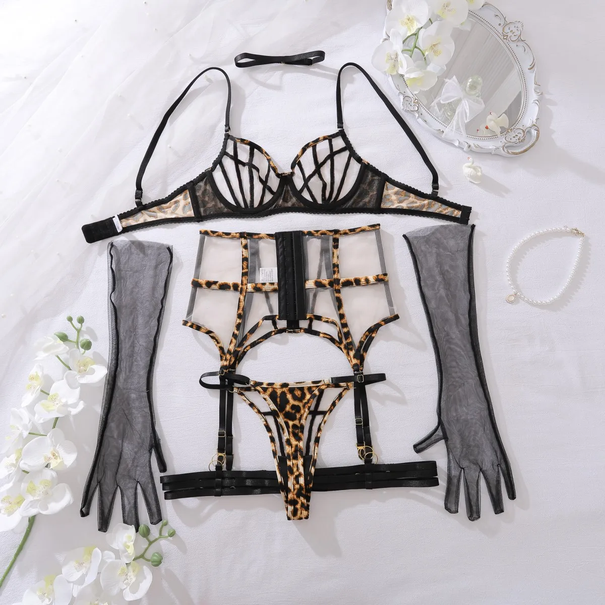 Ellolace Premium Sexy Female Lingerie Luxury Leopard Diamond Bra Underwear with Choker Gloves Sissy Intimate Hot Women Outfit