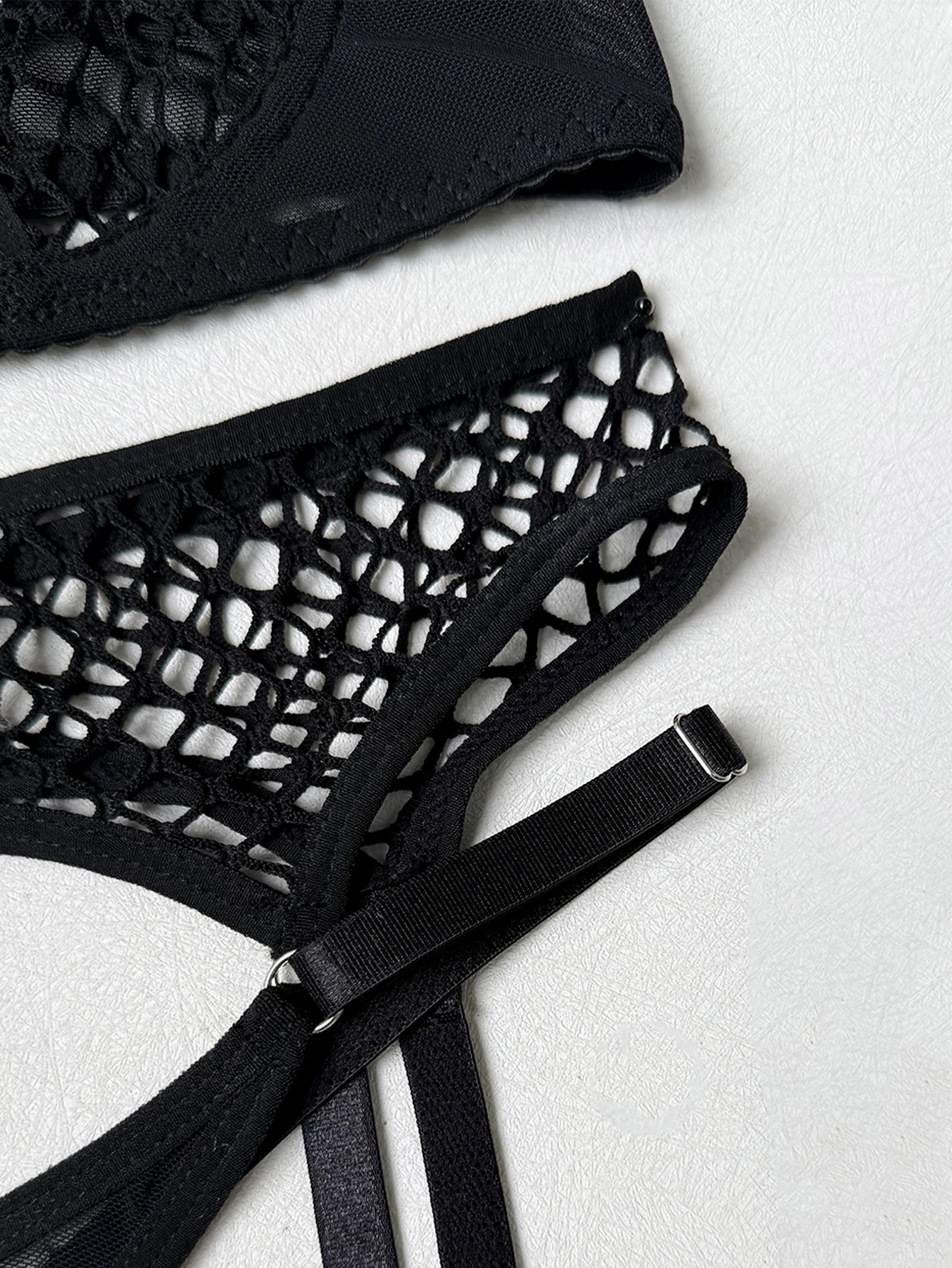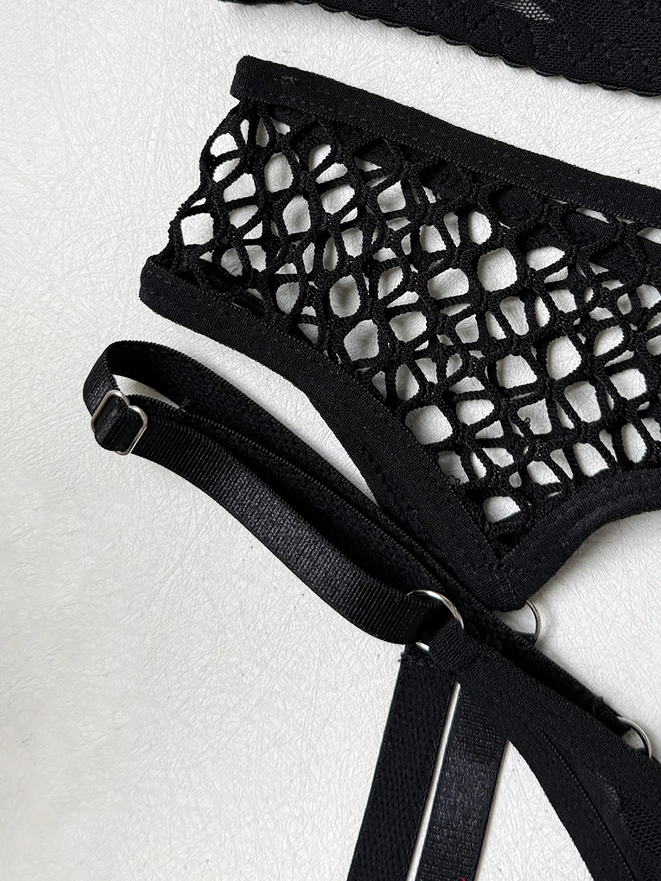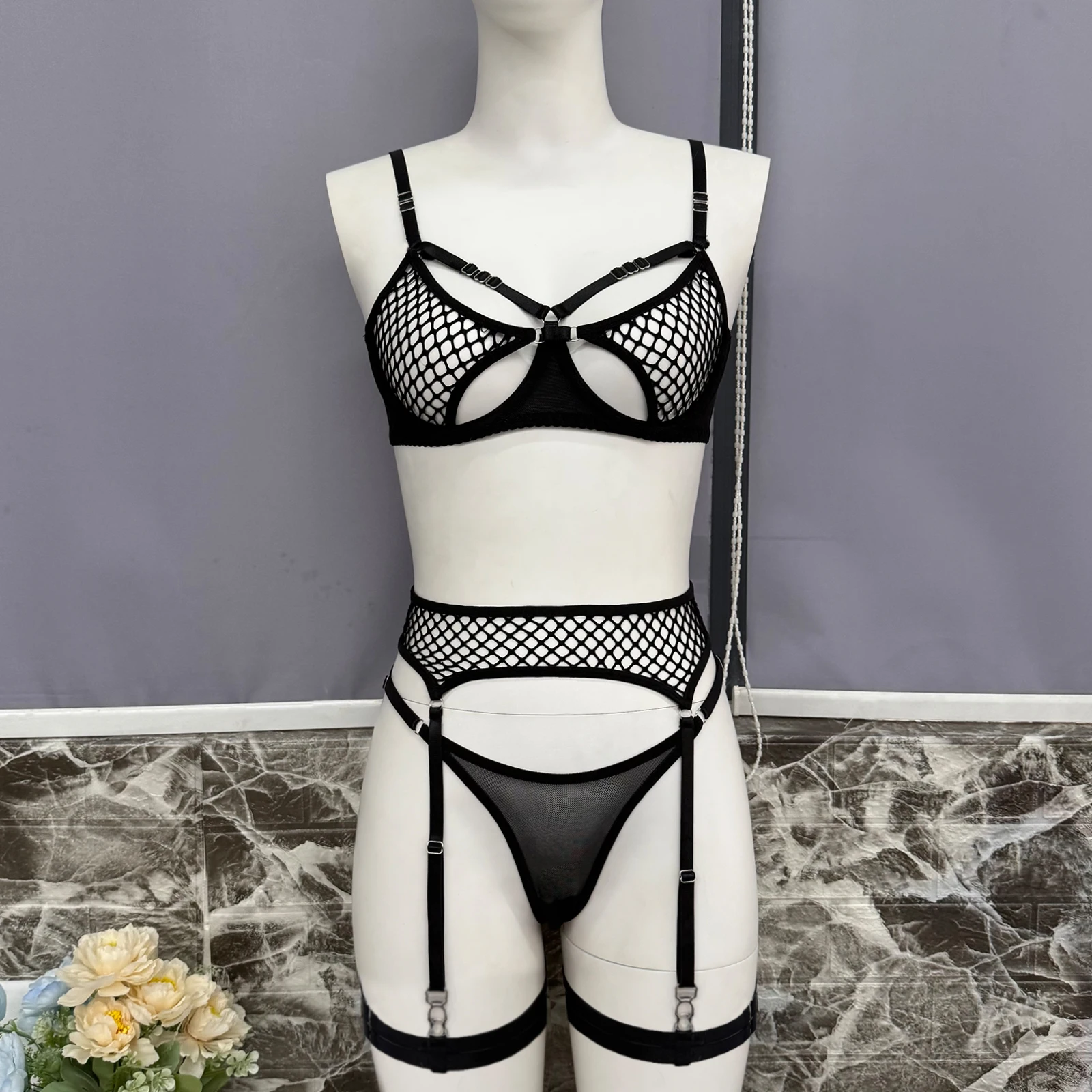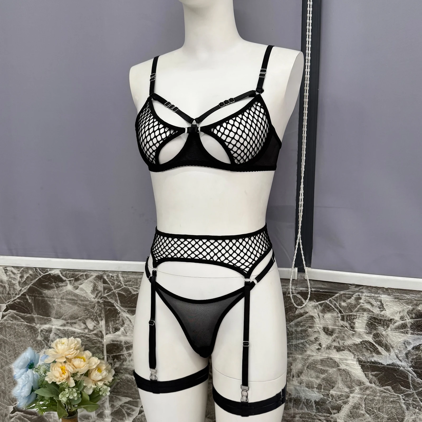 Ellolace Seductive Lingeries Sexy Hot See Through Bra Belt Thong 3PC with Leg Circles Tempting Fishnet Hollow Women’s Underwear