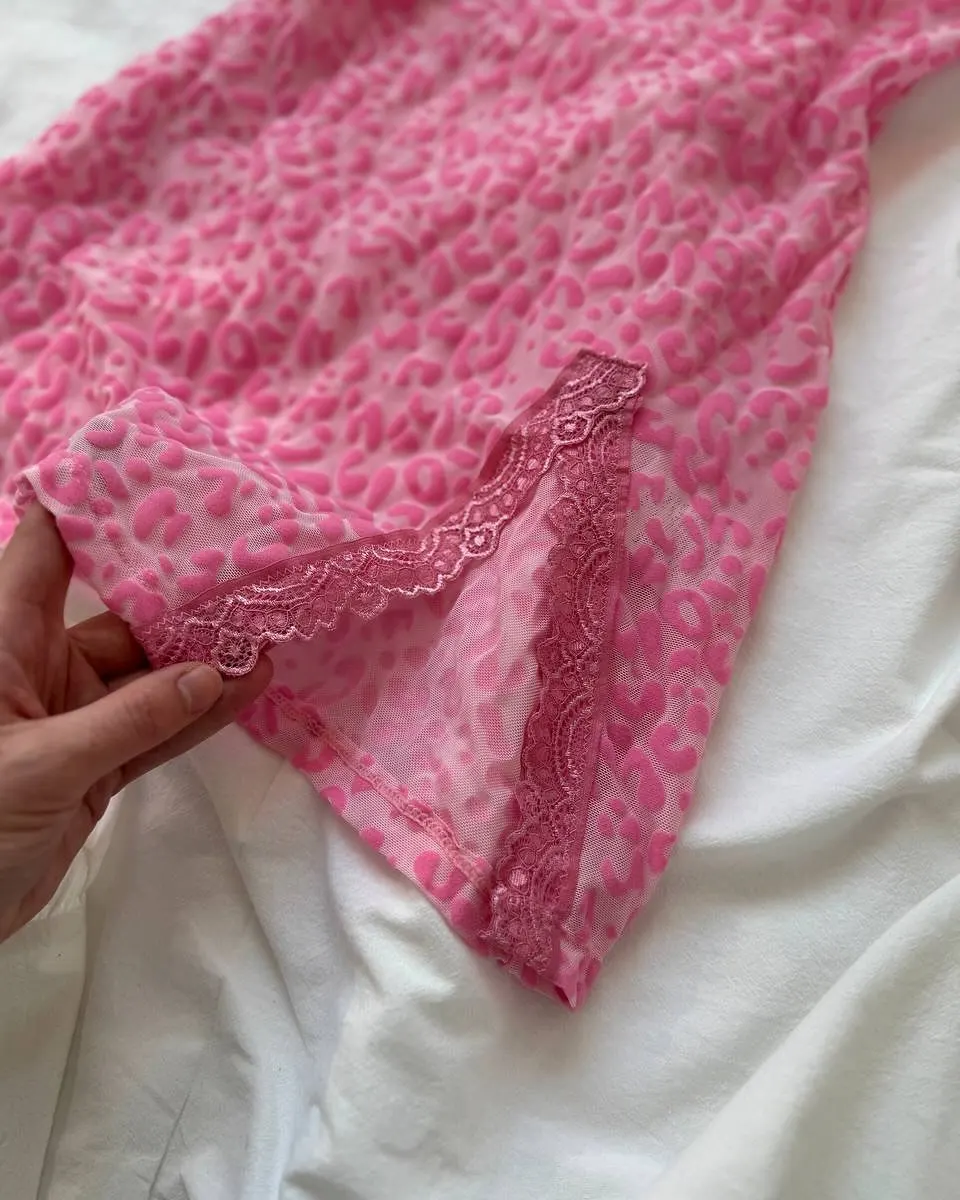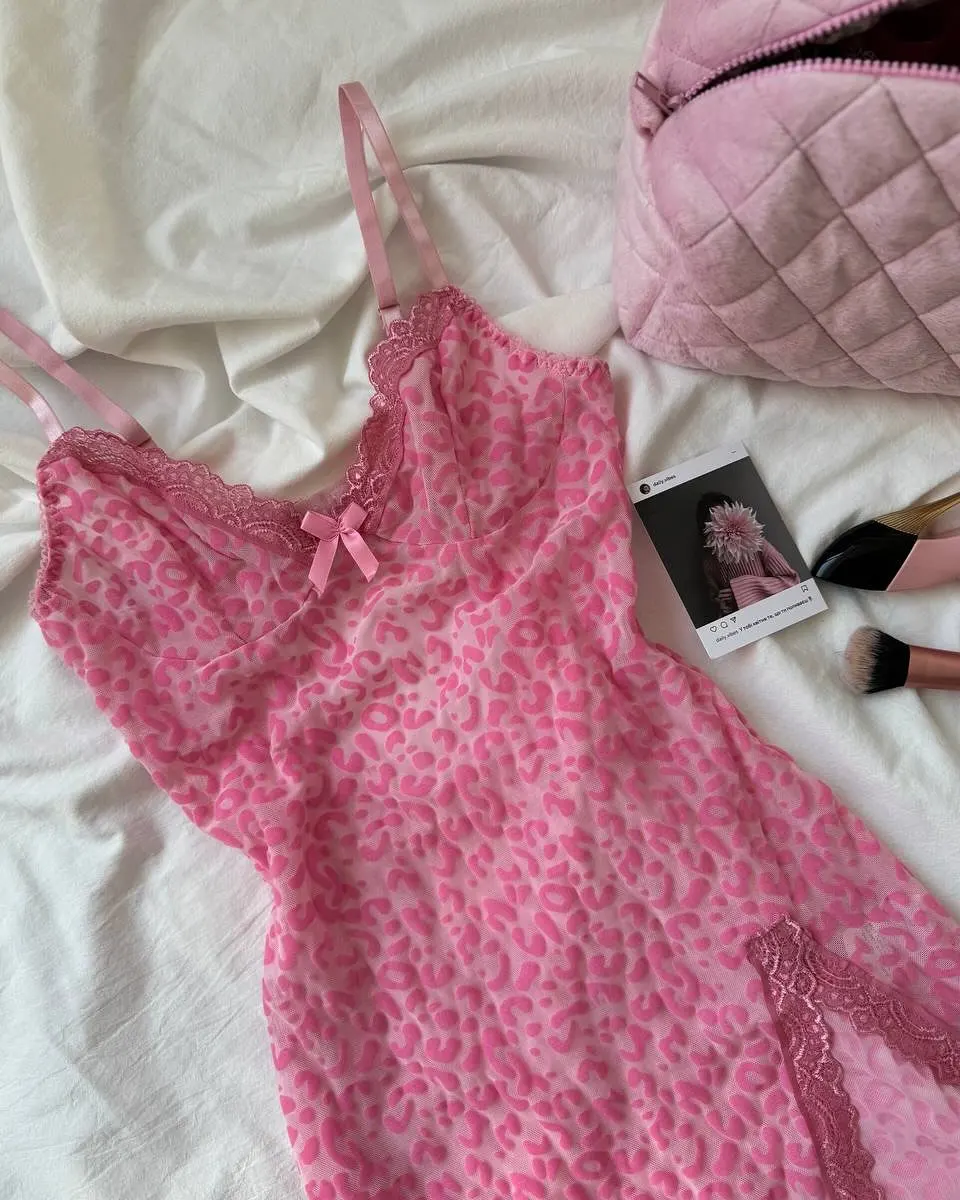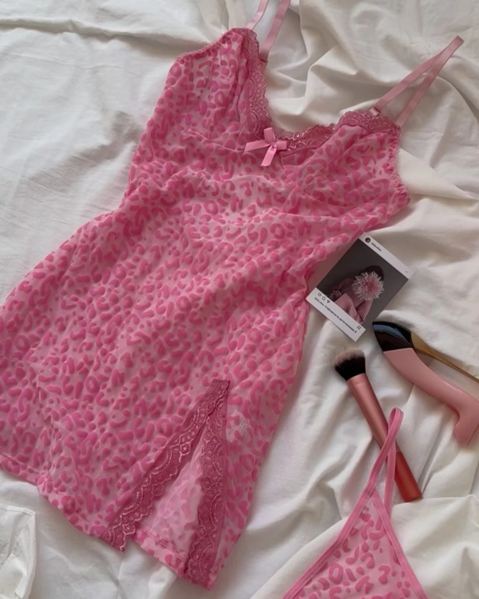 Ellolace Sensual Women’s Dress Beautiful Deep-V Neck Lace Split Sets Sheer Leopard with Thongs Sleepwear Babydoll Party Mini Kit