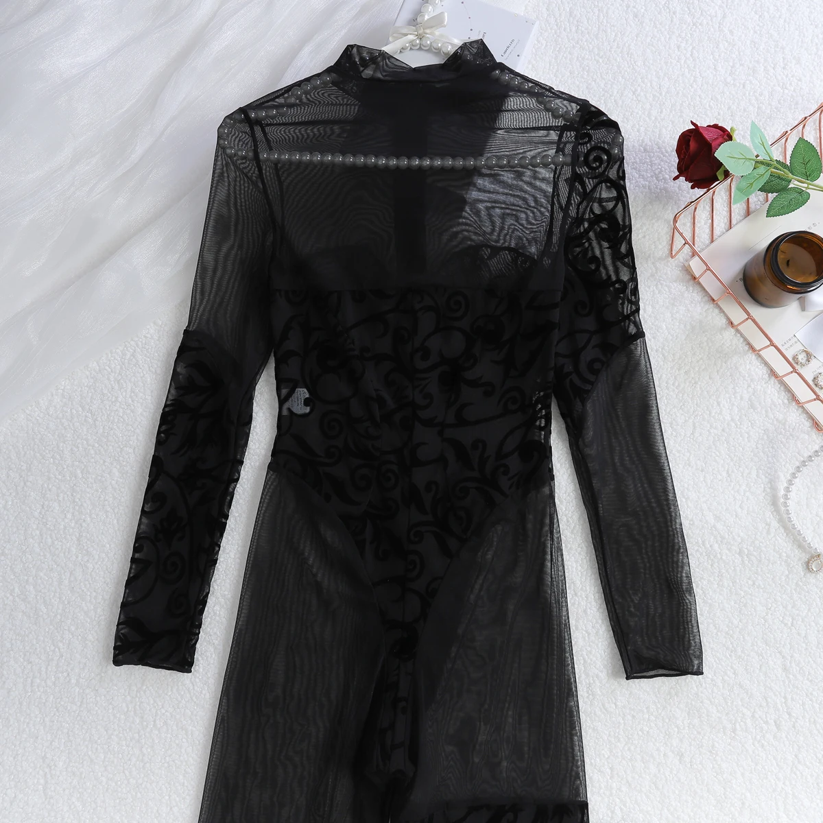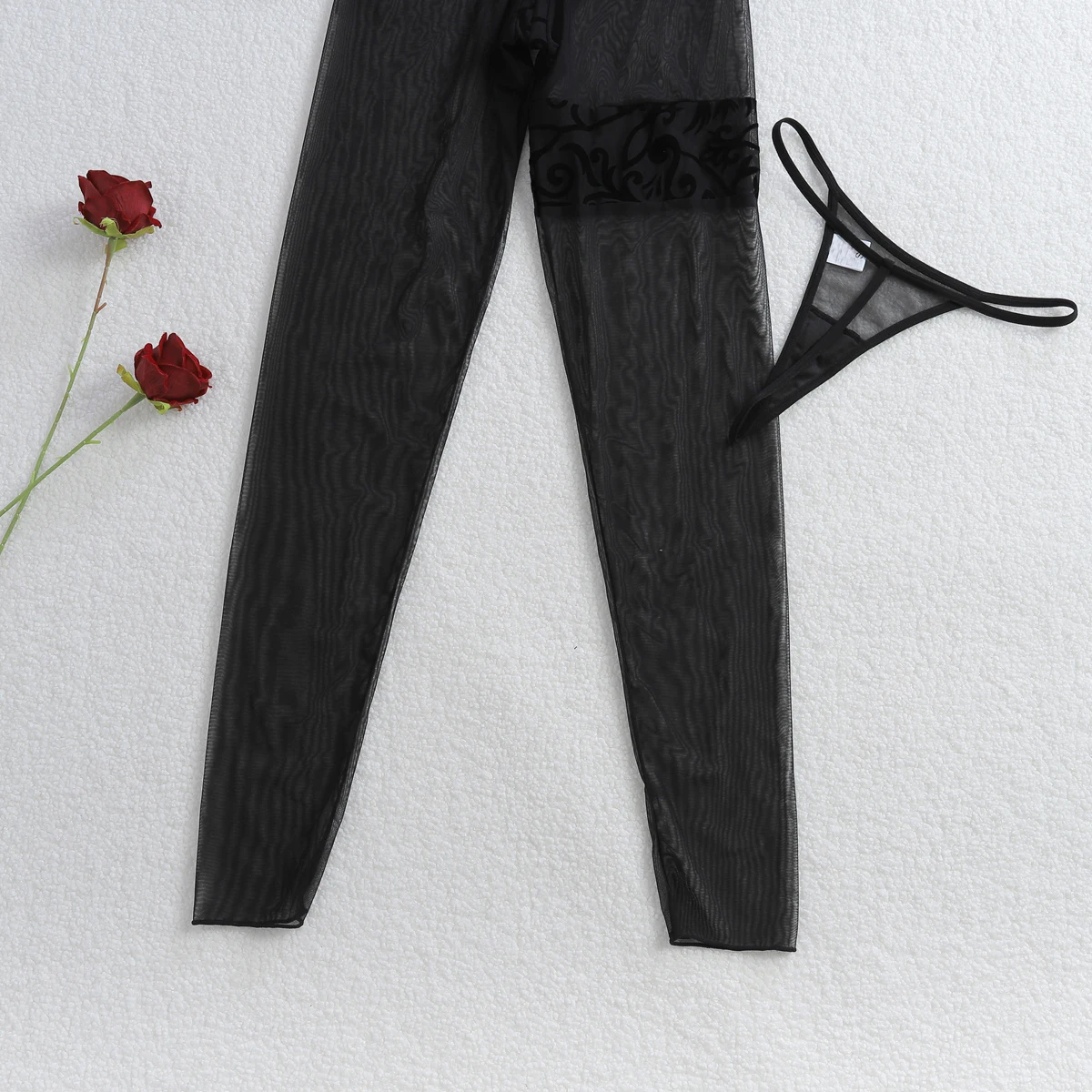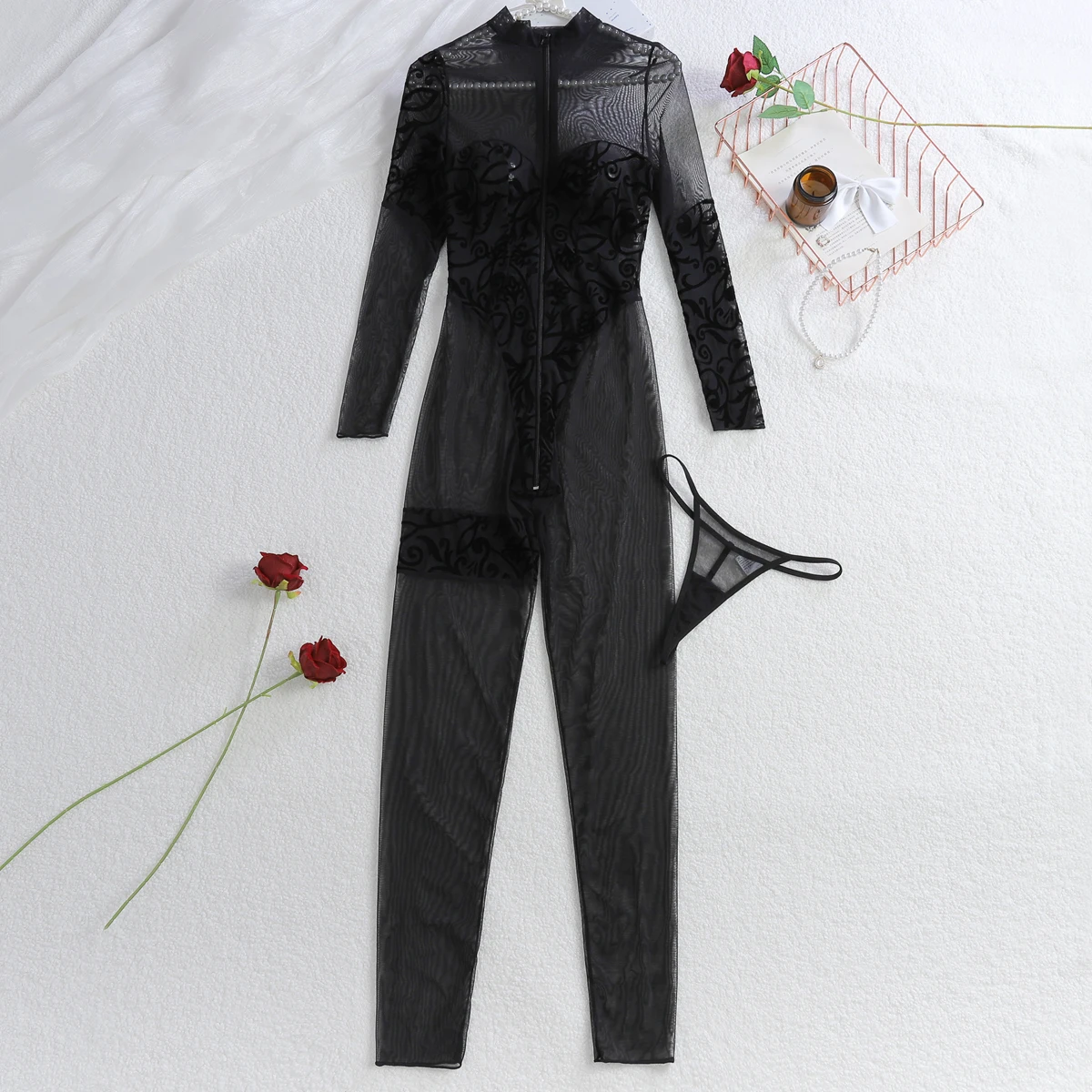 Ellolace Willowy Sexy Female Lingerie Porno Erotic Embroidered Zip Jumpsuit 2PC Set Long Sleeve Exclusive Patterns Body Thong