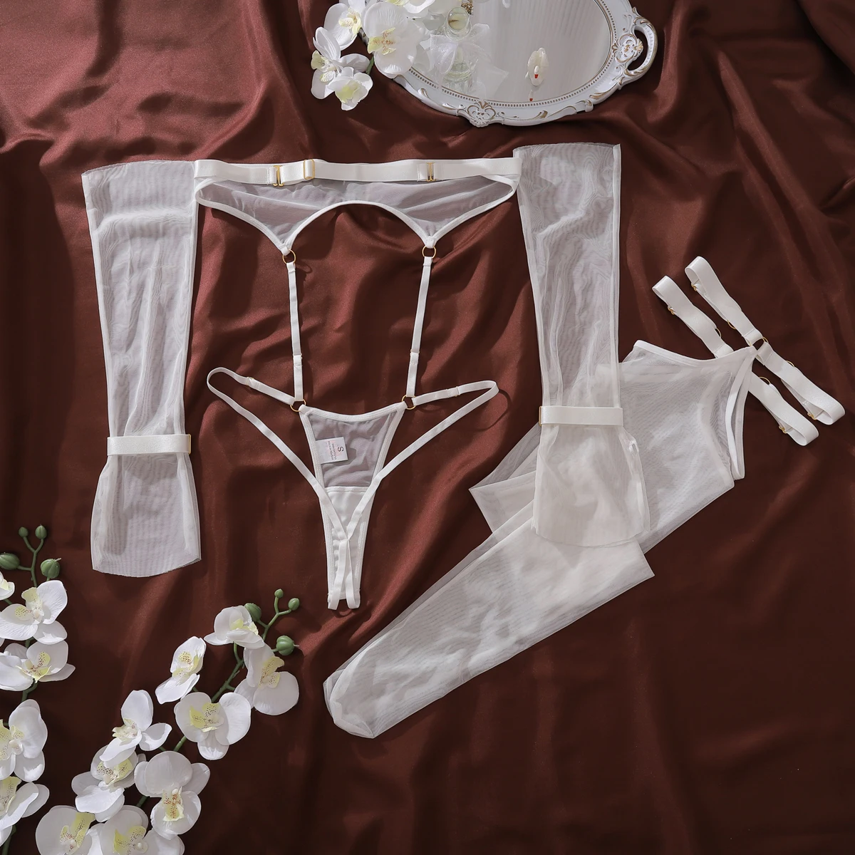 Ellolace Willowy Sexy Lingerie Exclusive Strapless Half Cup Bodysuit Seductive Open Crotch 5PC Body Set See Through Dancer Kit
