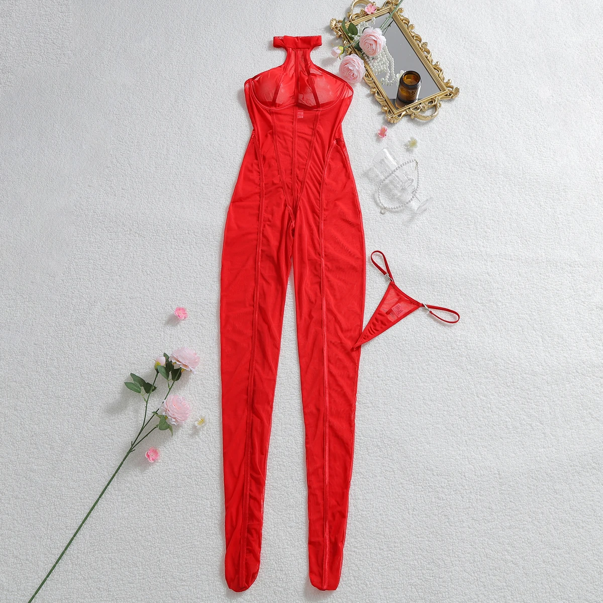 Elloloace Porno Sexy Lingerie Exclusive Stripes Halter Sleeveless Jumpsuit 2PC Set Metal Fastener Thong Backless Sheer Bodysuit