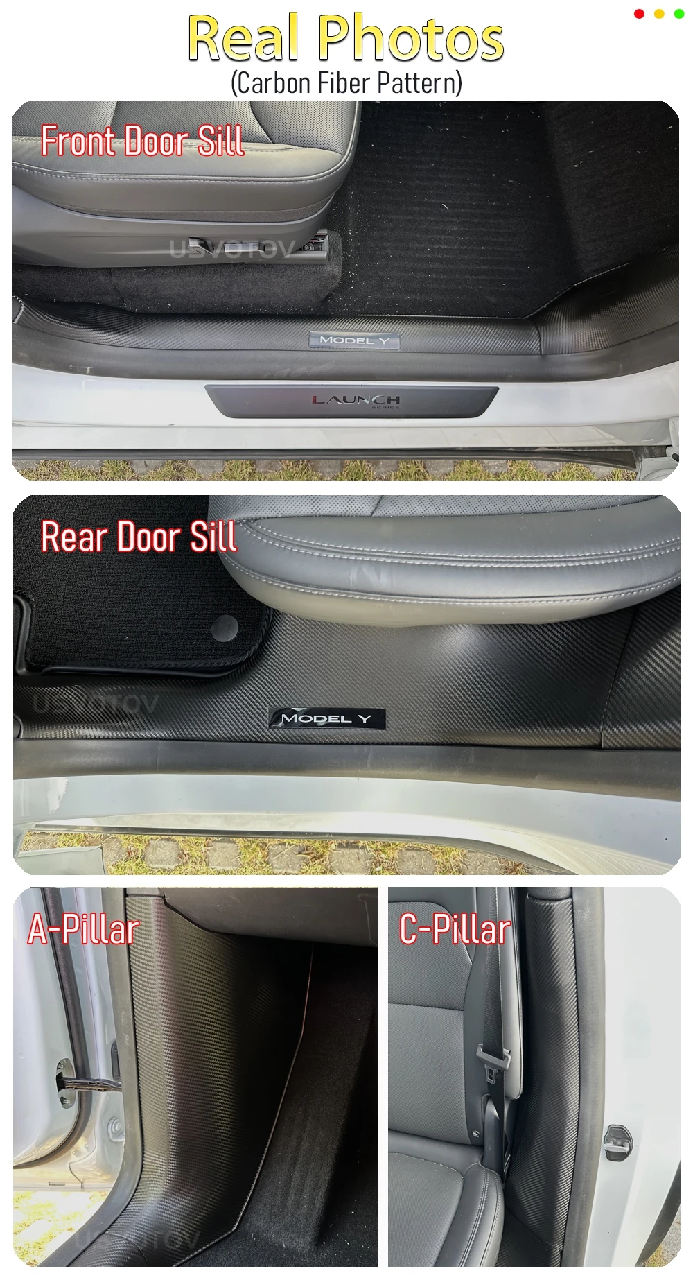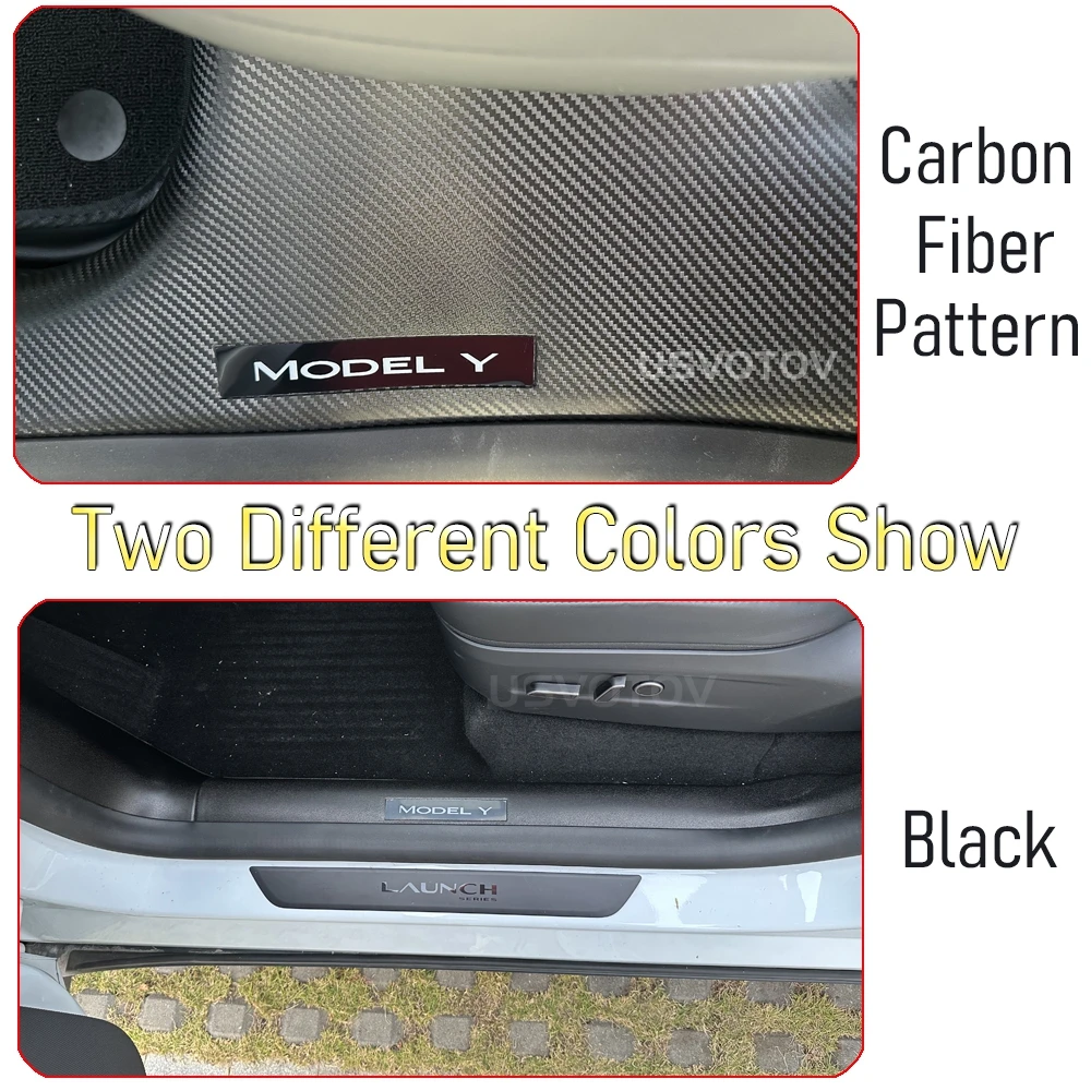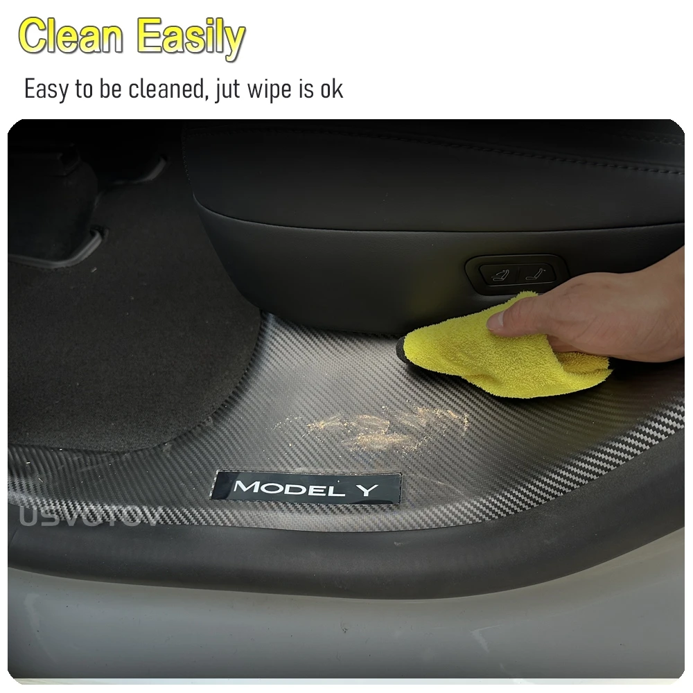 The door sill guards can protect your Model Y rear door sill from scratch when passengers get in and out of the car. The factory ones’ is felt material, it is difficult to be cleaned. This usvotov model y rear door sill protector will make it easy to be cleaned.