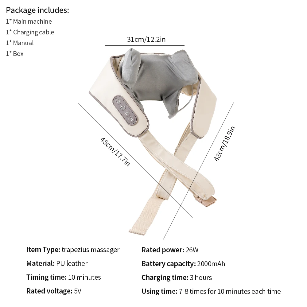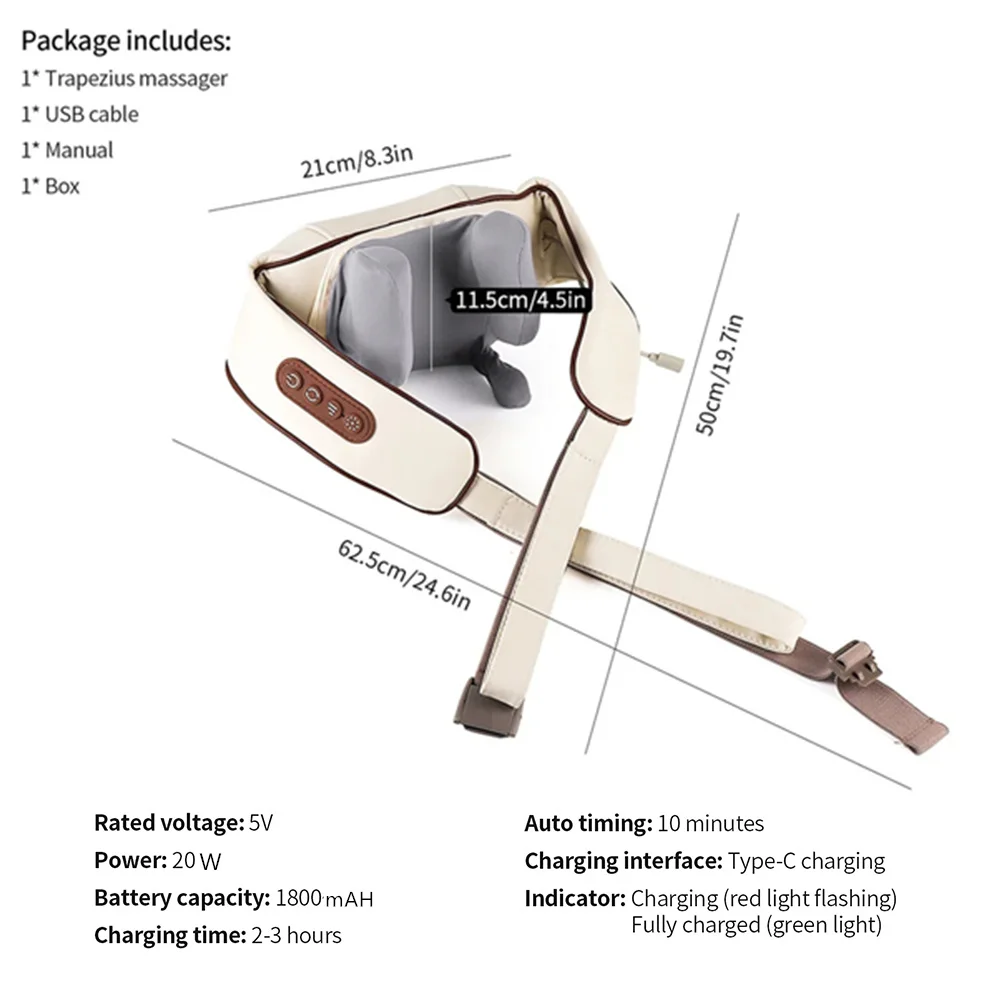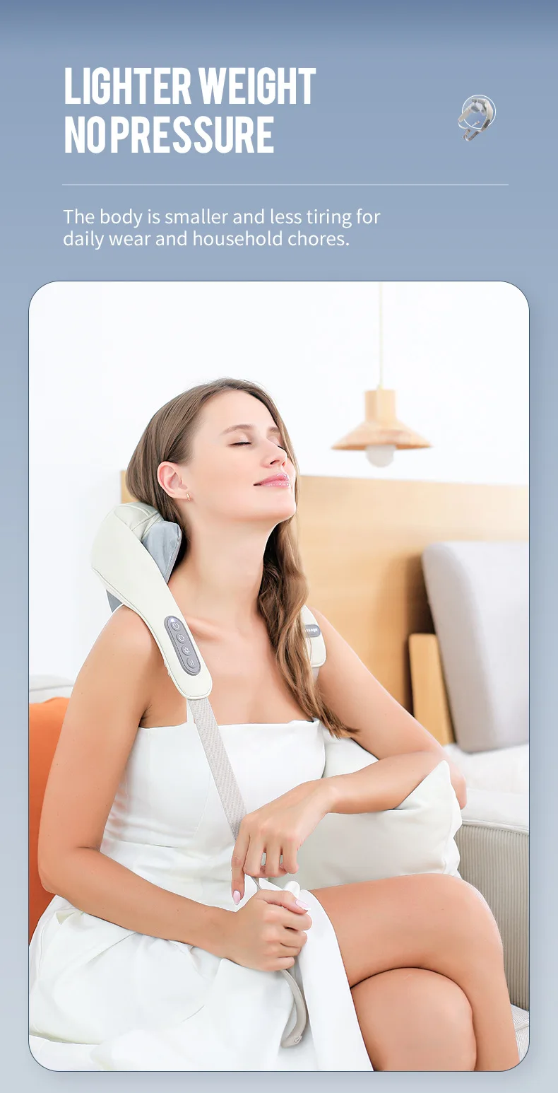1.Trapezius massager.Six claws, two sets of 3D massage heads with four large massage contactscover the shoulder and neck, trapezius muscles, allowing your neck to relax and no longer feel tired and uncomfortable.