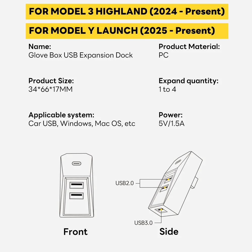 Feature – 4-In-1 Ports glovebox USB Hub (3 USB ports and 1 Type-C port). Support: Game pad/Boombox& Music USB/Dashcam/Portable Wifi ;