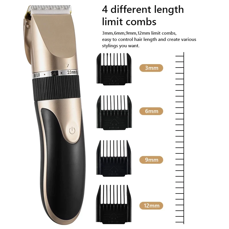 5.5 Gear free adjustment, rotary adjust for hair trimmer at any length,adjustment range: 0.8-2.0mm, and equipped with 4 limit combs(3mm / 6mm / 9mm / 12mm), with it, you can freely control hair length.