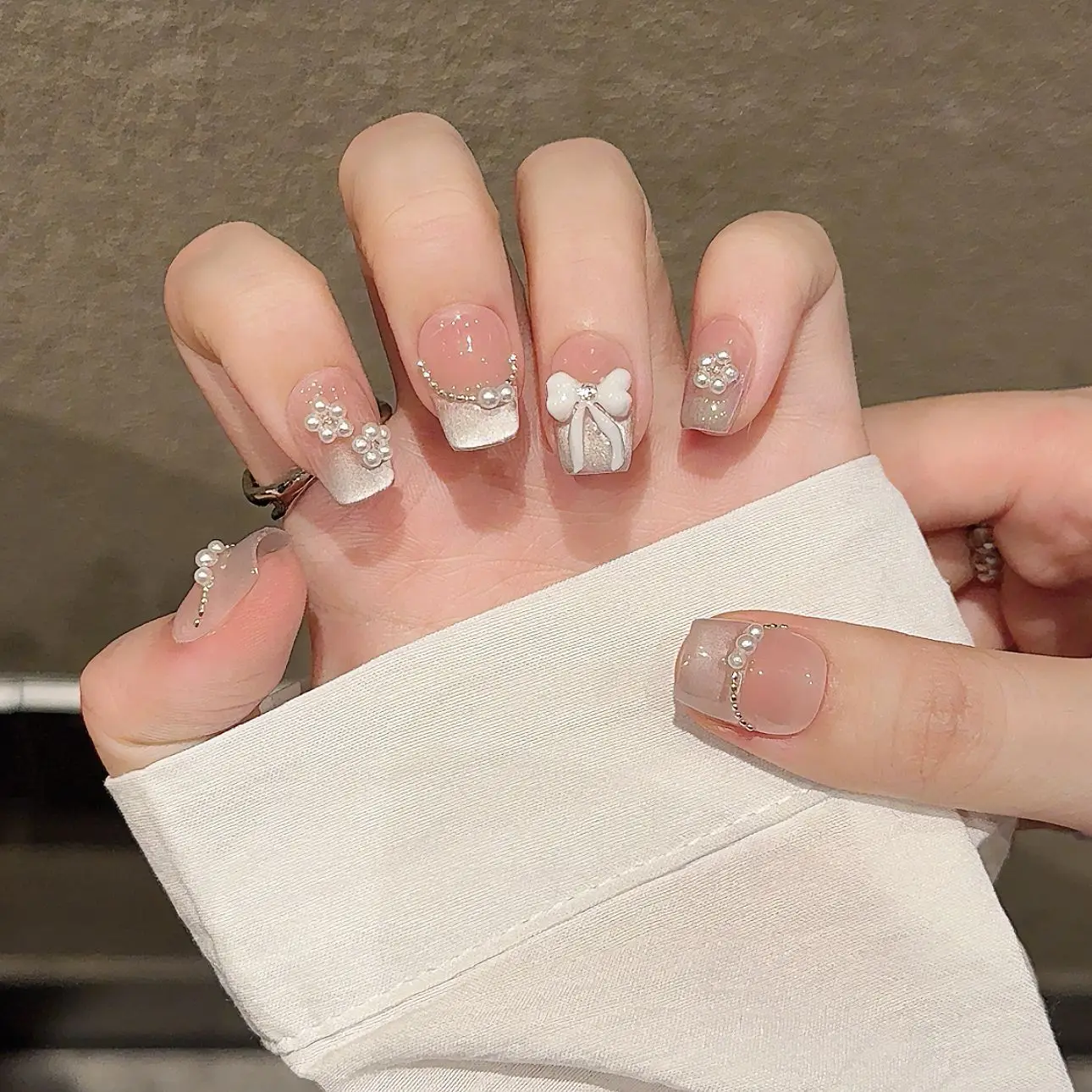 Handmade Press on Nails Sweet Bowknot Pearl Decor French Fake Nails for Women Girl Wearable Shiny Cat Eye Bride False Nail Tips