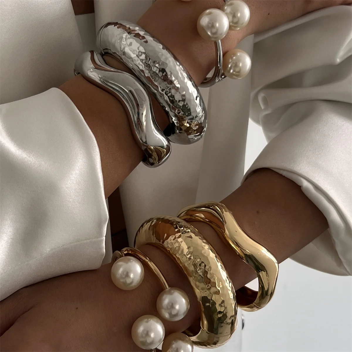 Ingemark 3 Style Creative Big Imitation Pearl Cuff Bracelet Women Trend 2025 Punk Heavy Metal Chunky Spring Bangle Steampunk Men