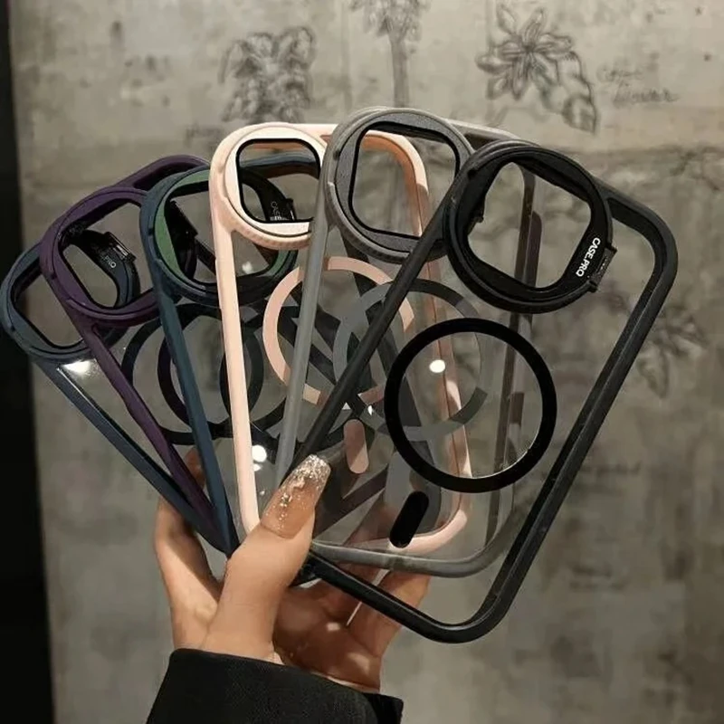 Luxury Magsafe Transparent Phone Case For iPhone 11 12 13 14 15 16 Pro Max Plus Magnetic Kickstand Stand Shockproof Bumper Cover