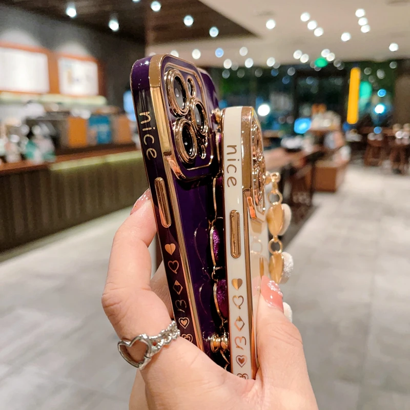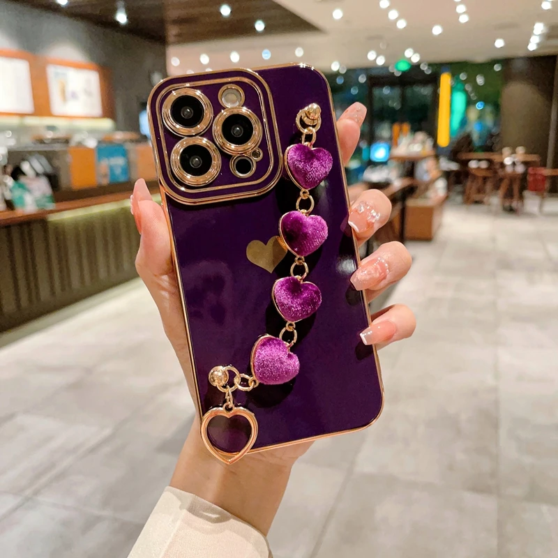 Luxury Soft Love Heart Bracelet Phone Case For iPhone 11 12 13 14 15 16 Pro Max XS X XR Max Plus lint Bumper Cover