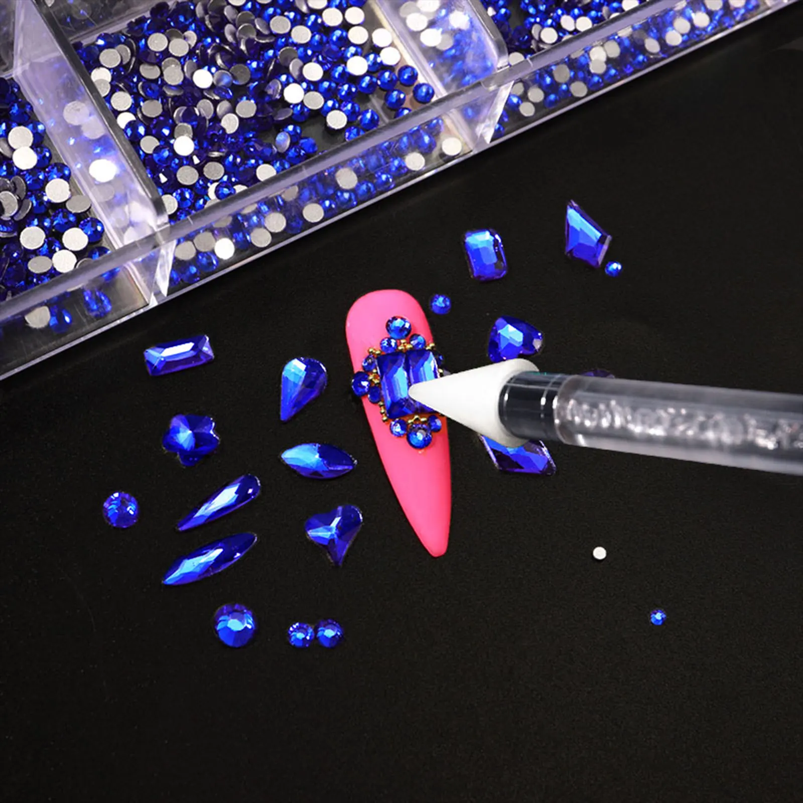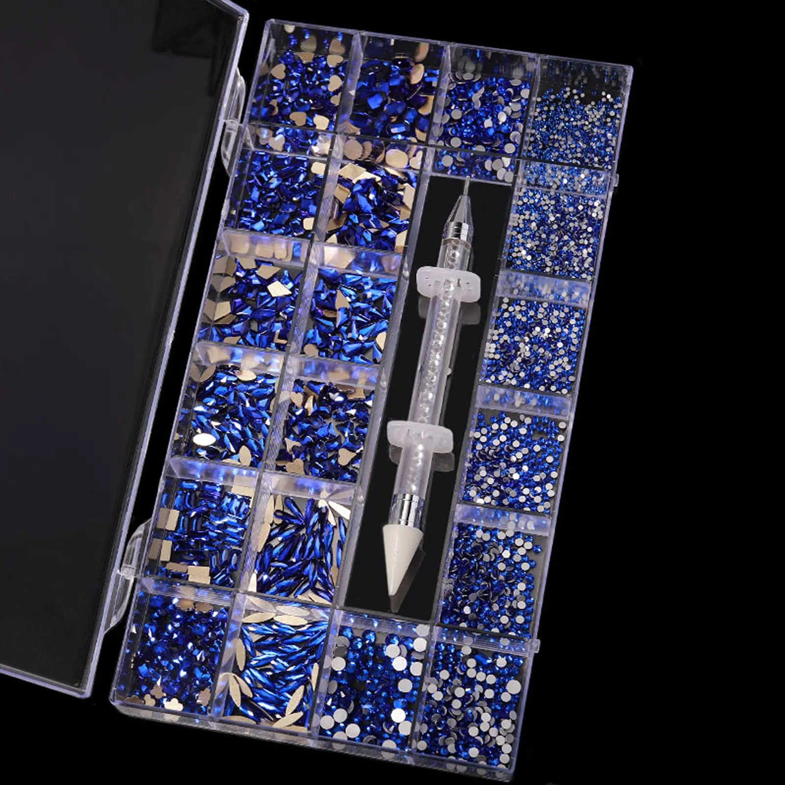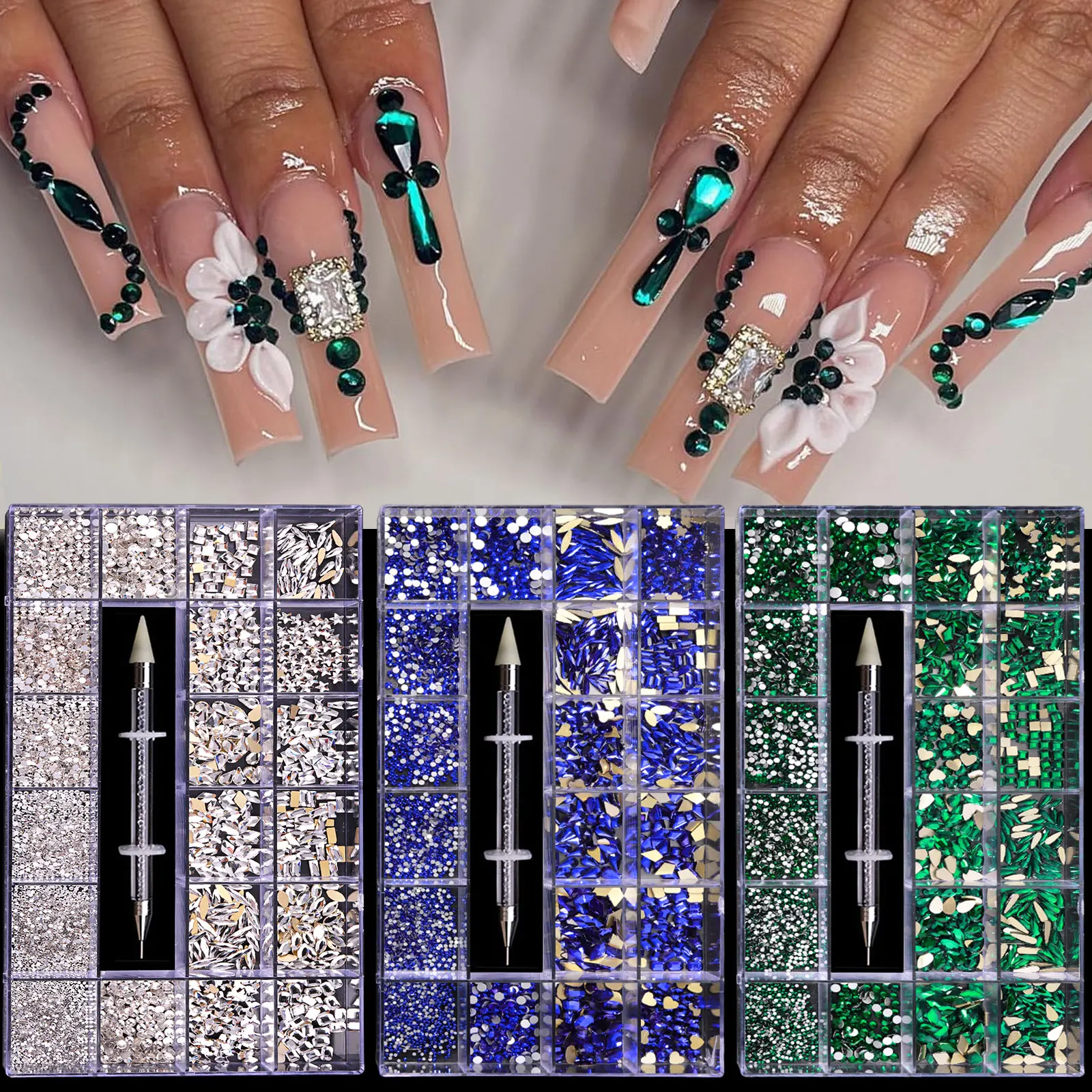 Mixed white Blue green Glass Crystal Diamond Flat Rhinestone Nail Art Decoration 21 Grid Box Nails Accessories Set With 1 Pick U