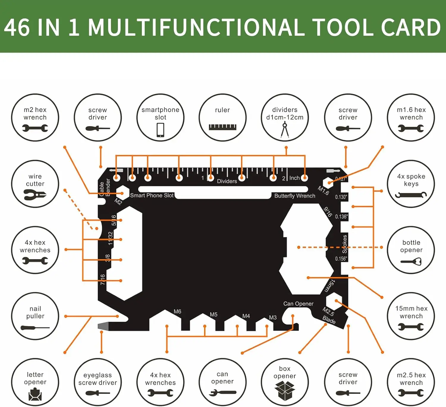 1.46-in-1 WALLET TOOL— Credit card multi tool delivers real-world functionality with its 46 in 1 Multi Toolpacked in a Credit Card Size, which allow it to serve as a bottle opener, phone stand, screwdriver, butterfly wrench, box opener, eyeglass screwdriver, hex wrench, bicycle spoke key, ruler (inch & cm), nail puller, letter opener, can opener, wire cutter, earphone holder, fruit peeler, blade & a money clip!