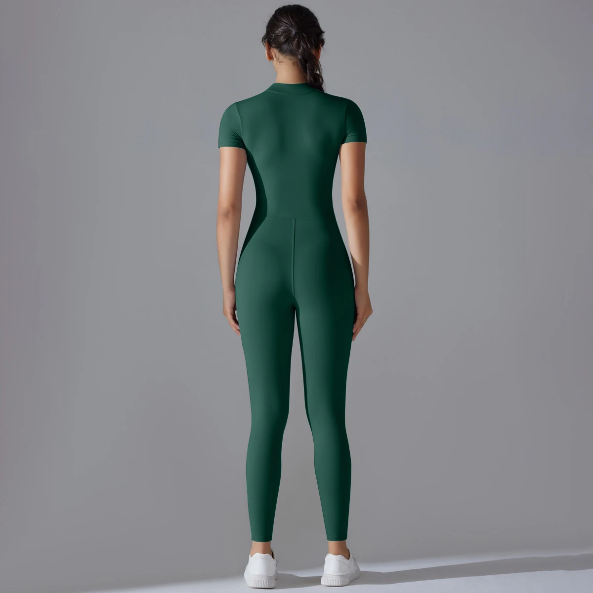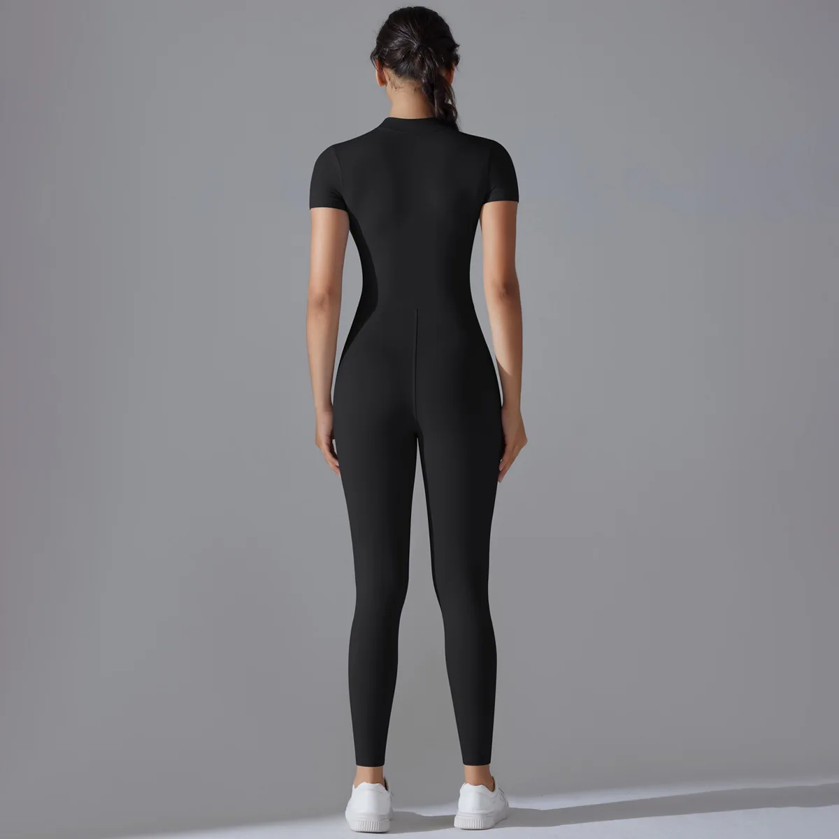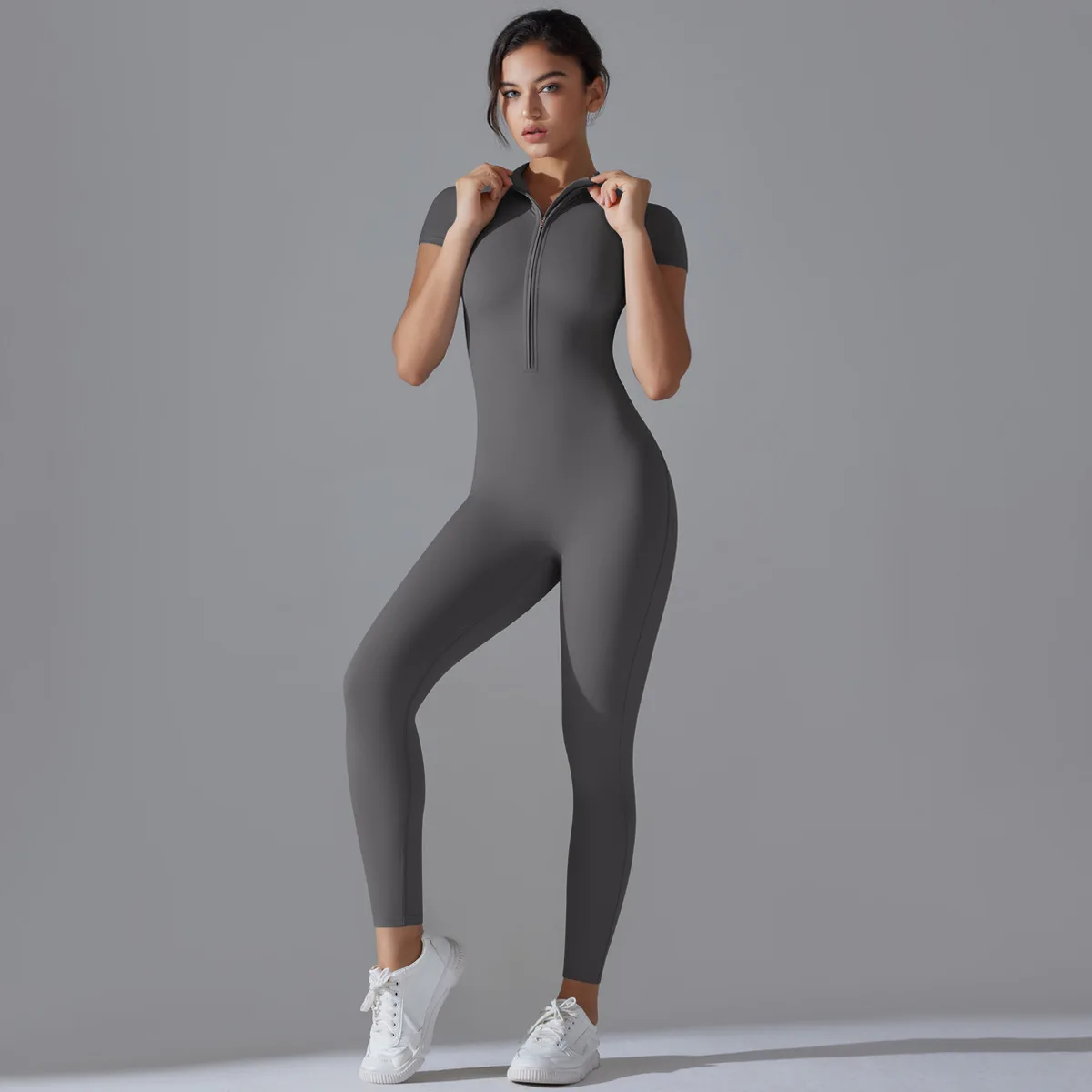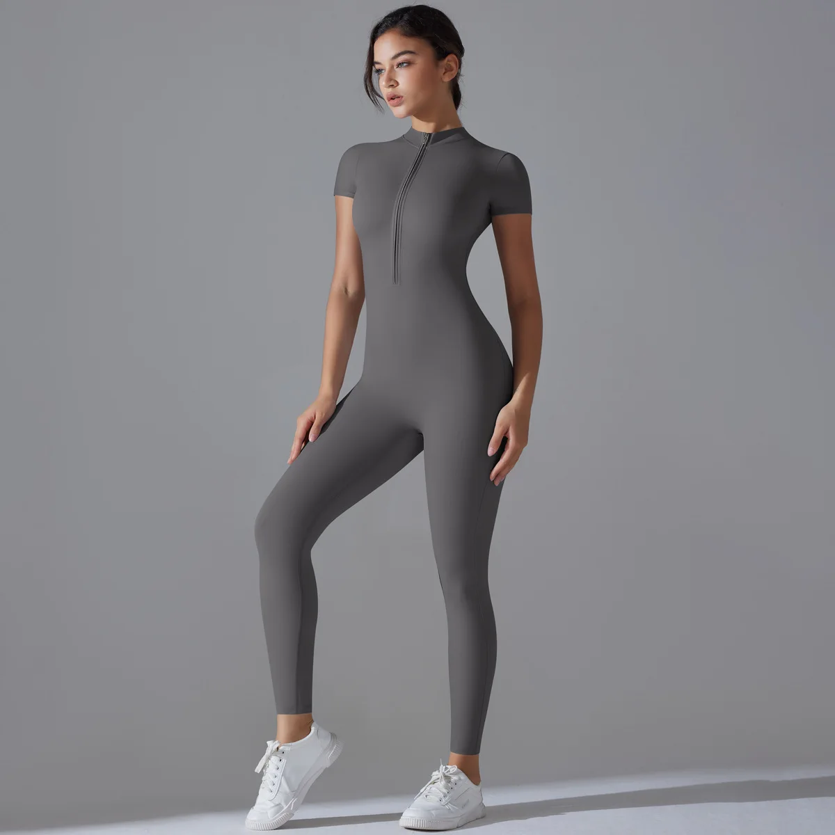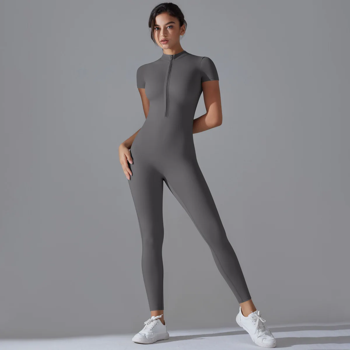 Naked zipper short sleeved yoga suit jumpsuit, quick drying breathable outdoor sports tight fitting jumpsuit, fitness suit