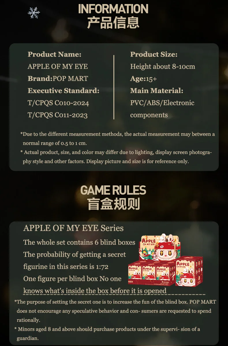 Be the first to review “POP MART APPLE OF MY EYE Series Blind Box Mystery Box Toys Kawaii Ornaments Figurines Home Decor Desktop Model Dolls Gilrs Gift” Cancel reply