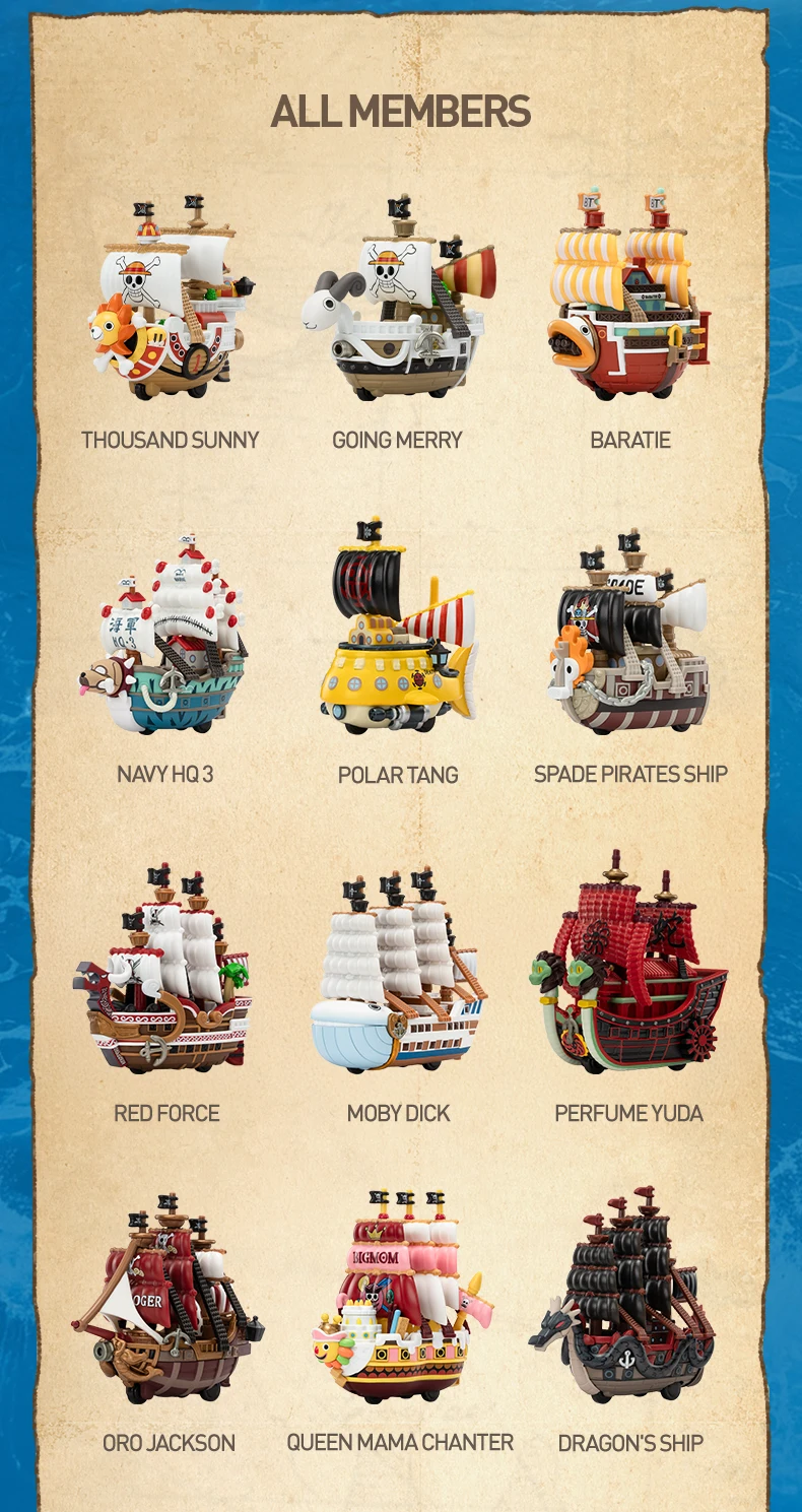 | Color | 1 Blind Box, 12 Blind Boxes, 12 Confirm Styles, BARATIE, DRAGON SHIP, GOING MERRY, HIDDEN, MOBY DICK, NAVY HQ 3, ORO JACKSON, PERFUME YUDA, POLAR TANG, QUEEN MAMA CHANTER, RED FORCE, SPADE PIRATES SHIP, THOUSAND SUNNY |
