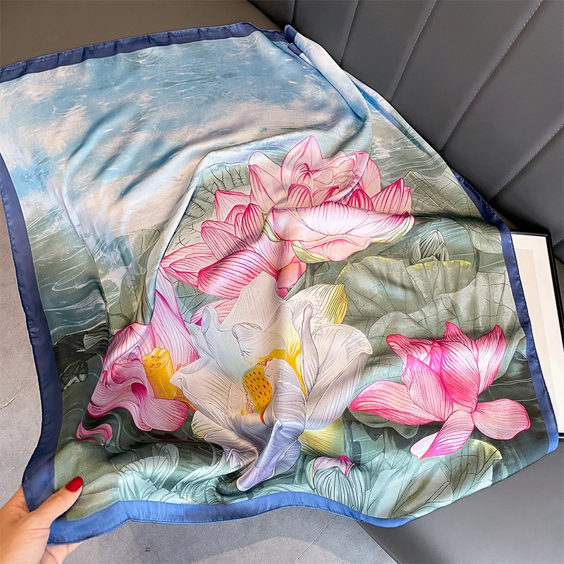 Designer Floral Square 65cm Neckerchief Women Real Silk Scarf Luxury Cotton Shawl 2025 Print Female Hijab Bandana Headband