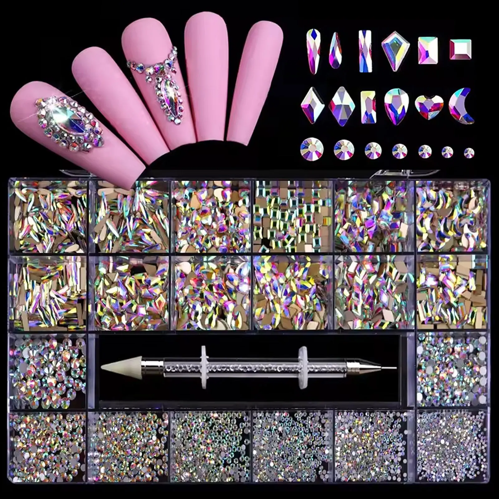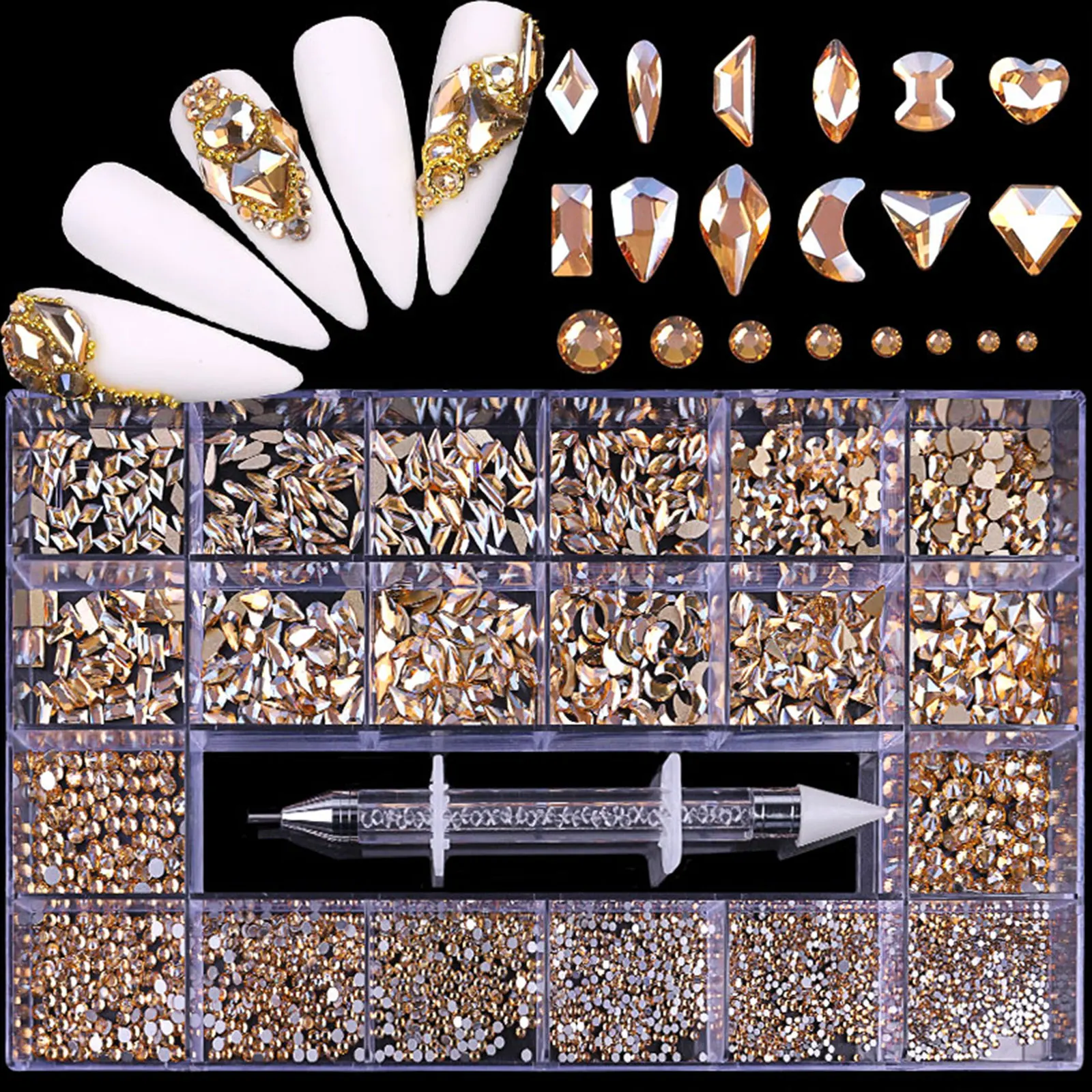 red champagne Glass Crystal Diamond Flat Rhinestone Nail Art Decoration 21 Grid Box Nails Accessories Set With 1 Pick Up Pen