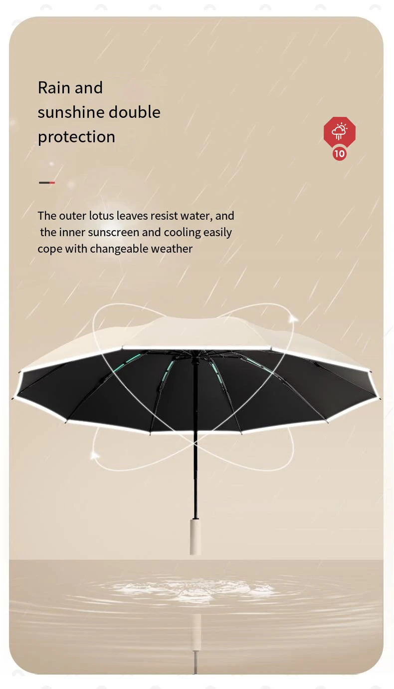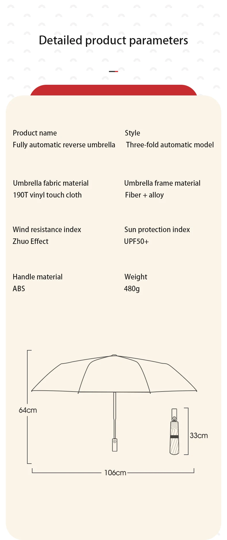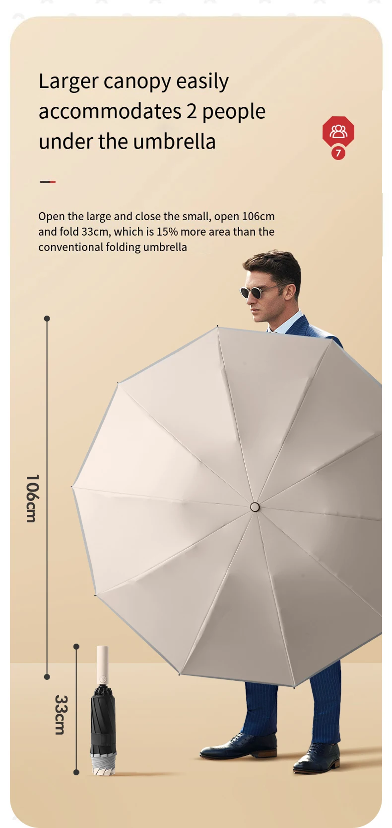 5.The diameter of the 106cm umbrella surface can accommodate 2 people and is only 33cm when folded.