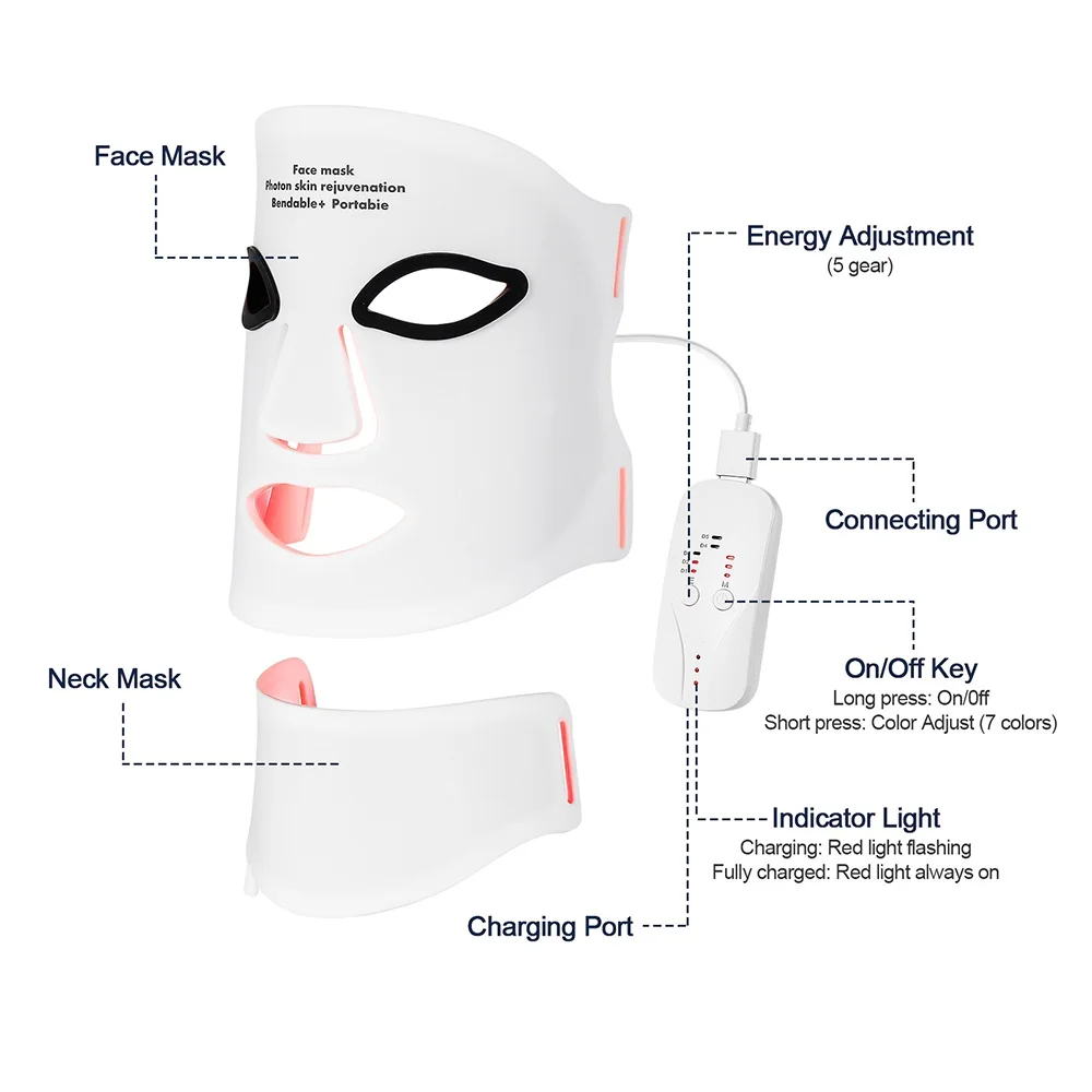 Silicone LED Mask Face With Neck 7 Colors LED Photon Red Light Infrared Therapy Flexible Facial Mask Repair Skin Wireless Use