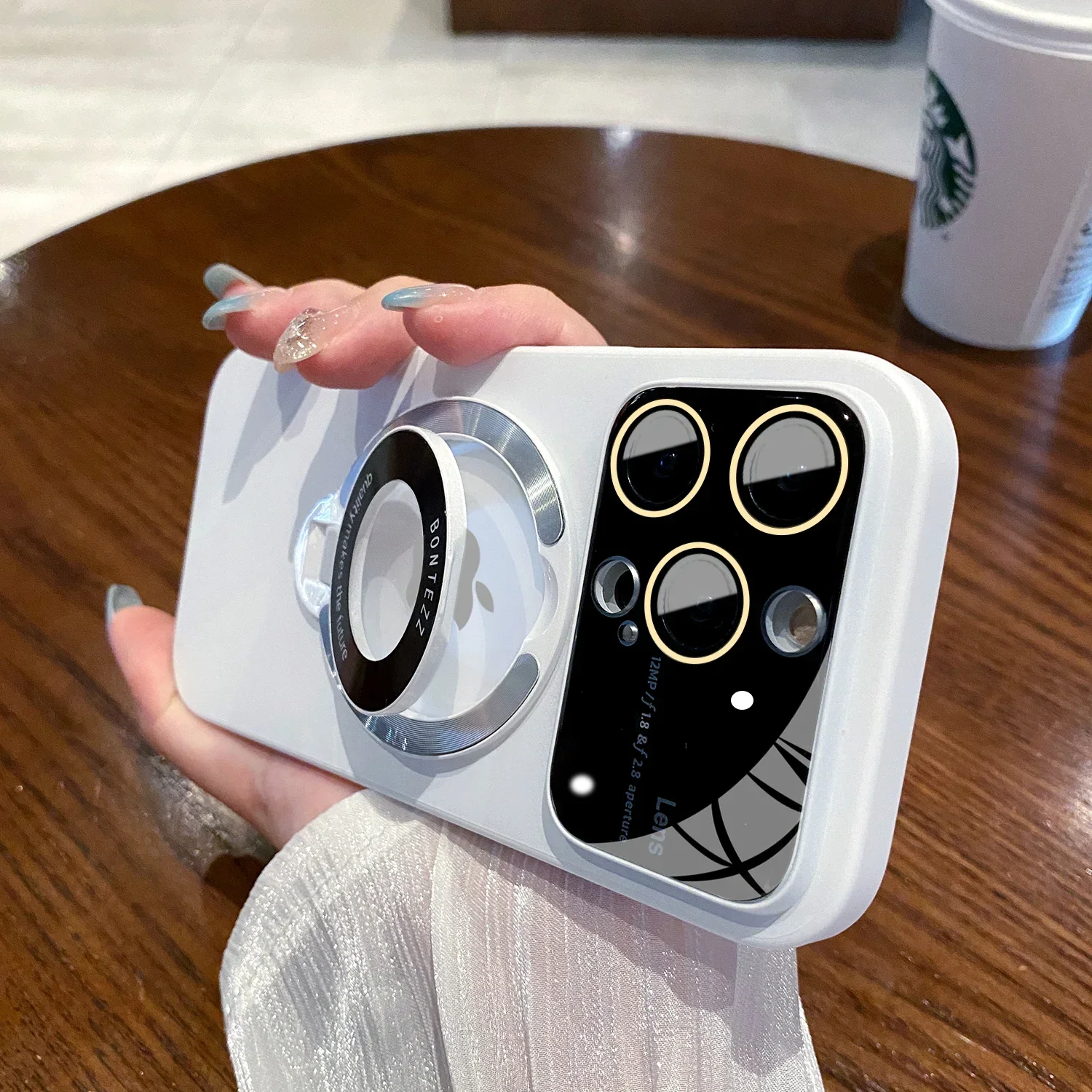 Slim Matte PC Bracket Case For iPhone 15 14 13 12 11 Pro Max 14 Plus For Magsafe Stand Holder Glass Lens Protector Luxury Cover