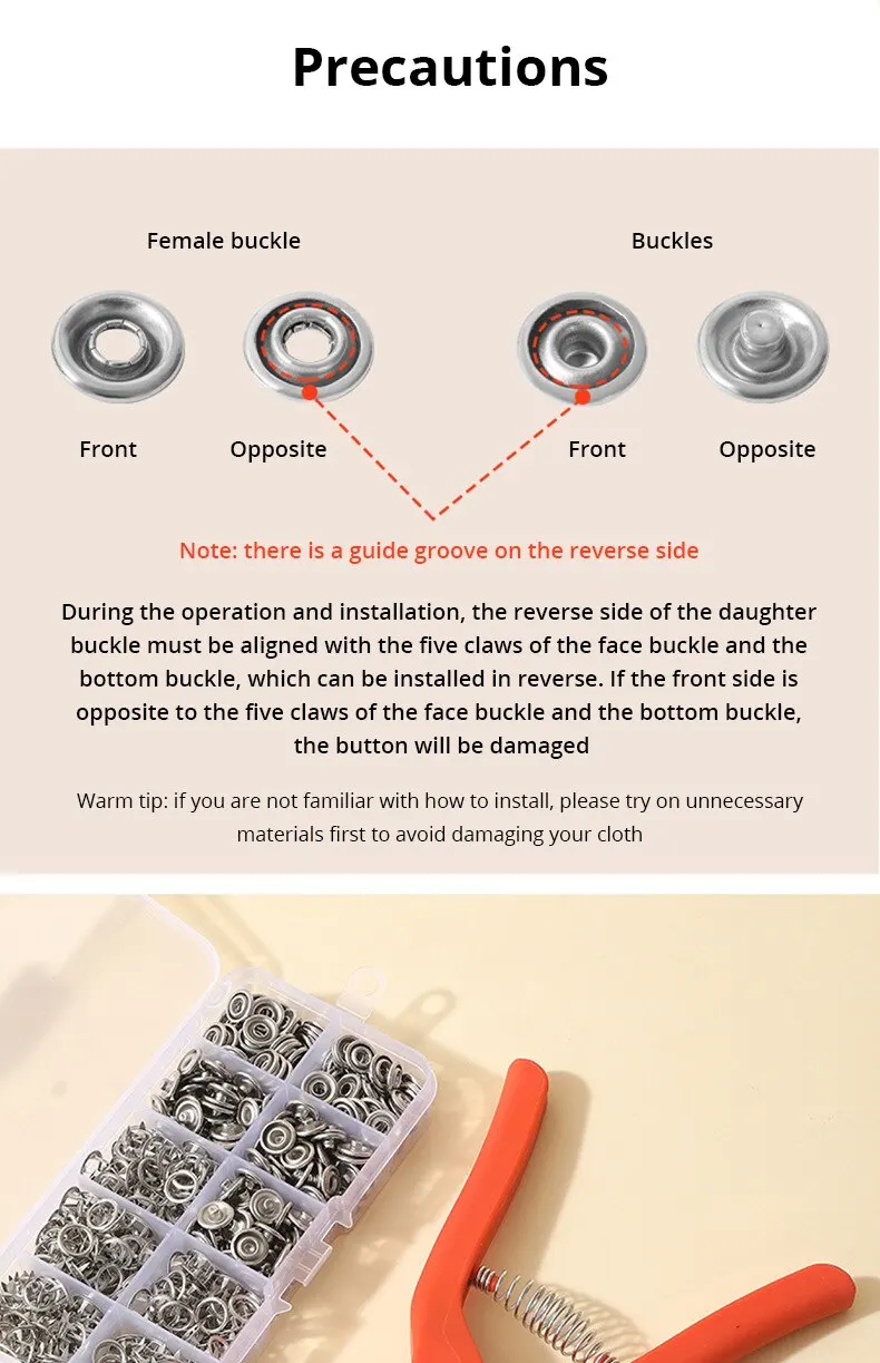 5. Applicable materials: Snaps are suitable for cotton fabrics, cardstock, flannel, silk, wool, thin leather or denim. Hold the garment tightly so that it does not fall off.