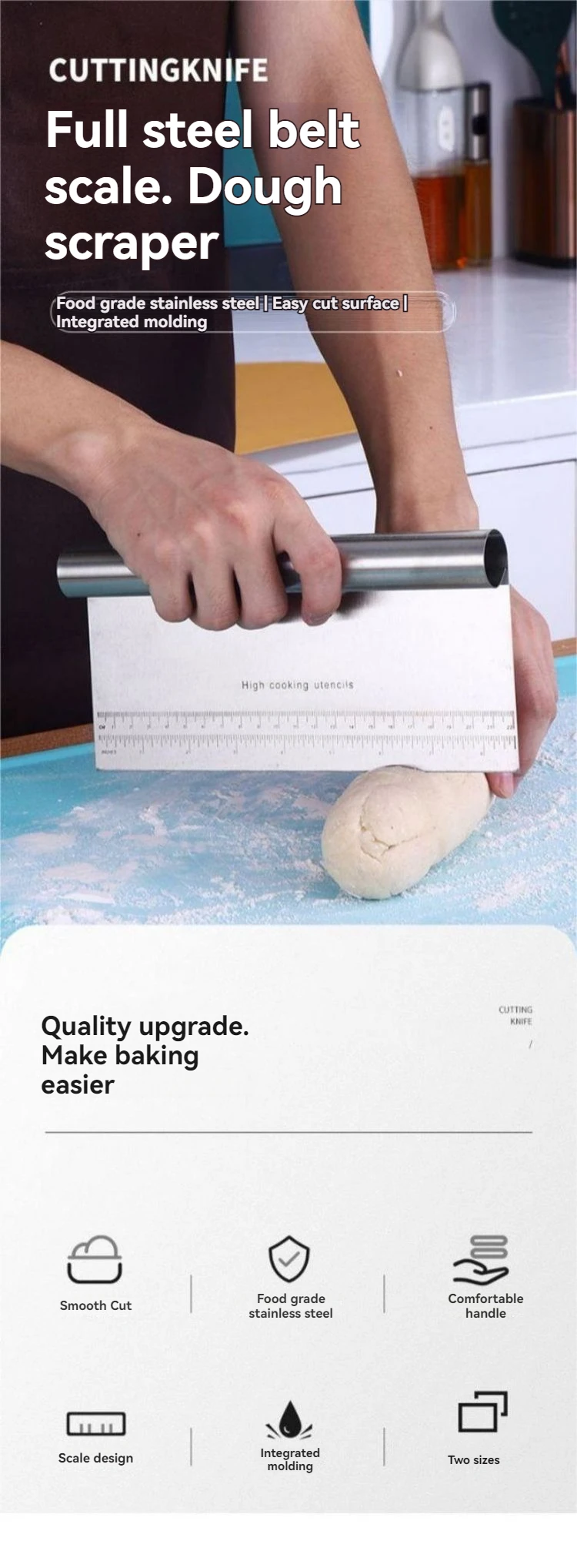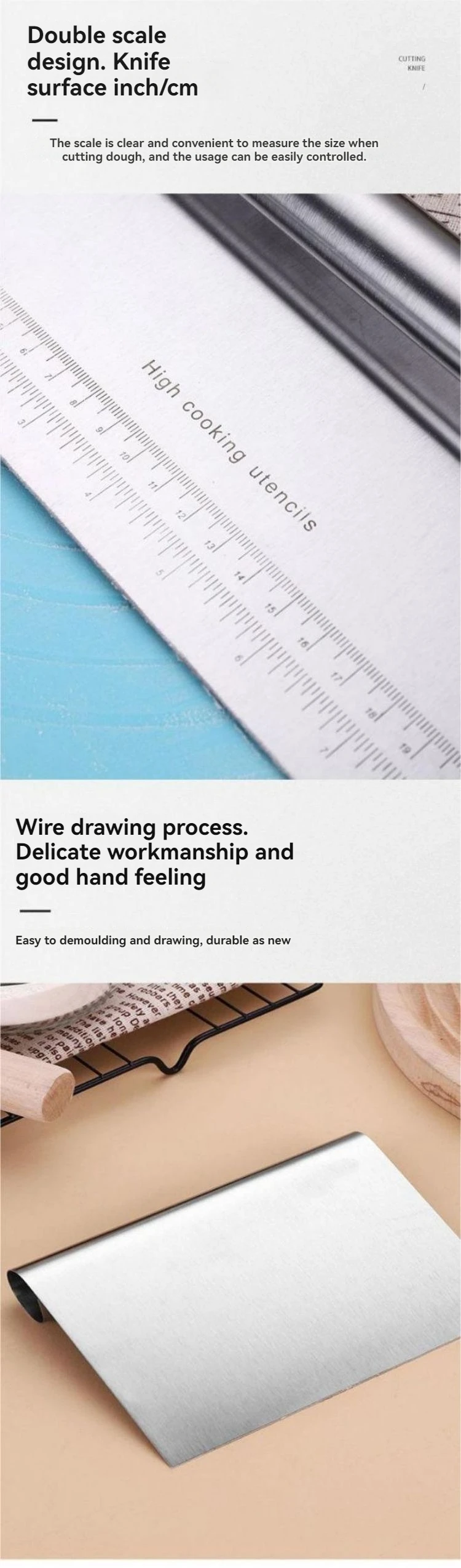 • Multifunctional Use :This versatile tool is not just a scraper; it can also function as a cutting knife, making it ideal for preparing cakes, sausages, flour, and more.