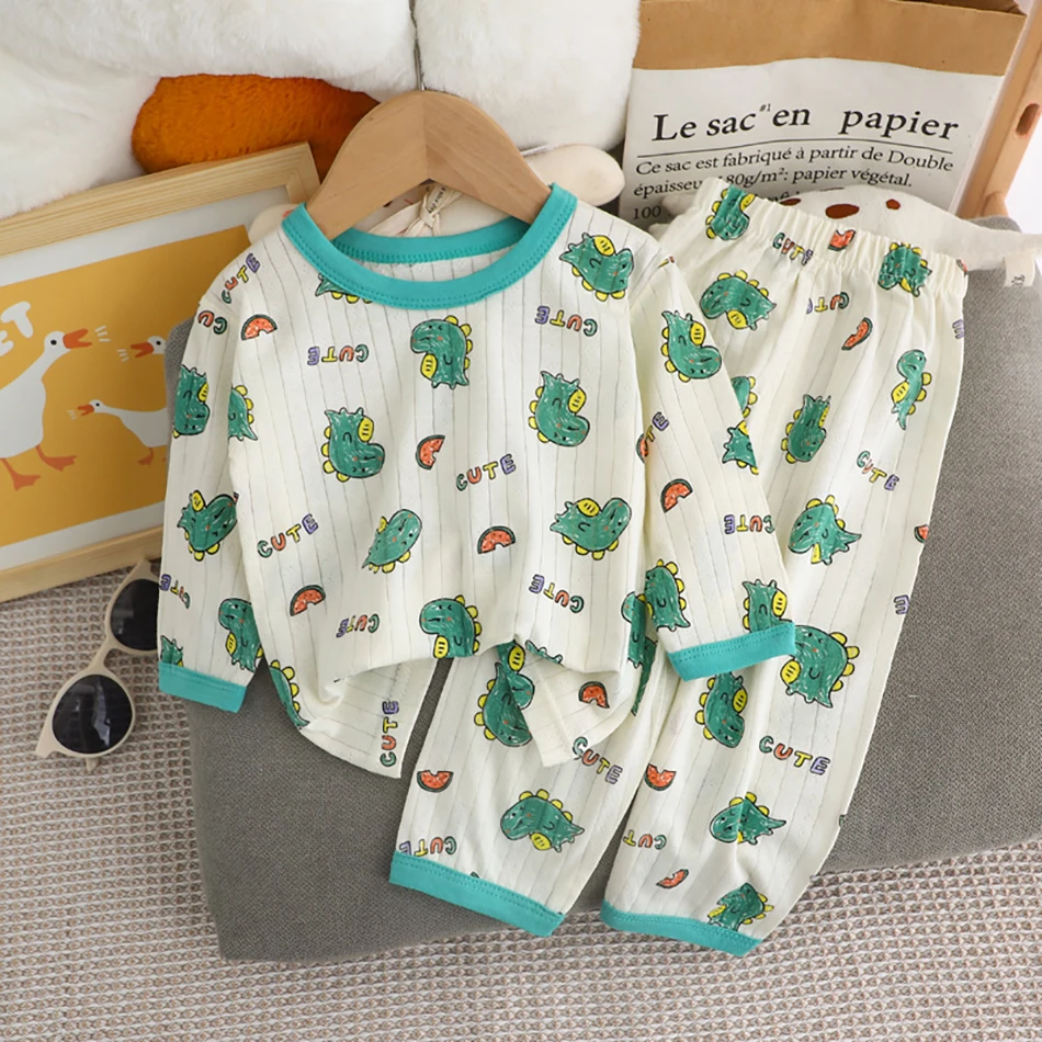 Summer Kids Cotton Long Sleeve and Pants Pajamas Set Soft Breathable Baby Sleepwear Cartoon Bear AC Room Wear Boys Girls Clothes