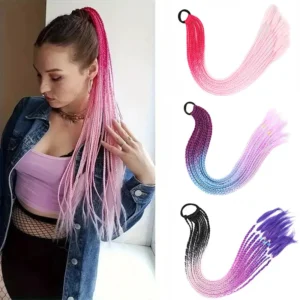 24Inch Synthetic Long Straight Box Braided Ponytail With Elastic Rubber Band Hair Extensions Rainbow Color Box Hairpiece