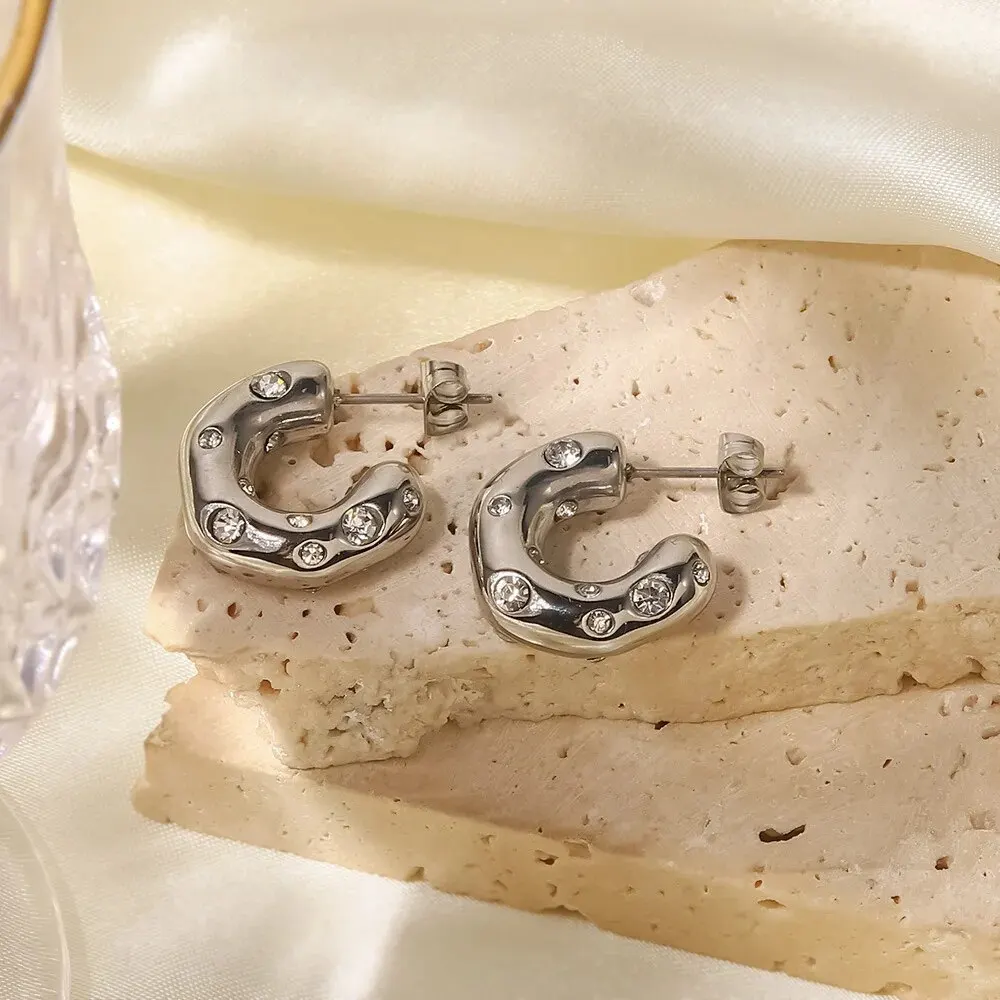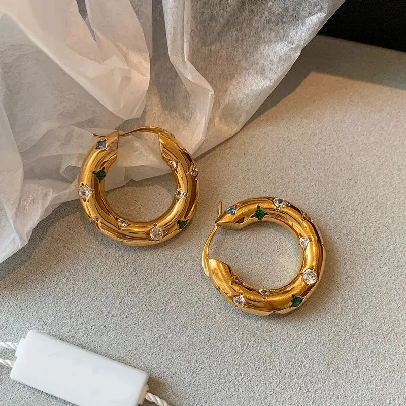 Trendy Gold Color Crystal Stainless Steel Round Earrings For Women Imitation Pearl Metal Earring Party Everyday Jewelry