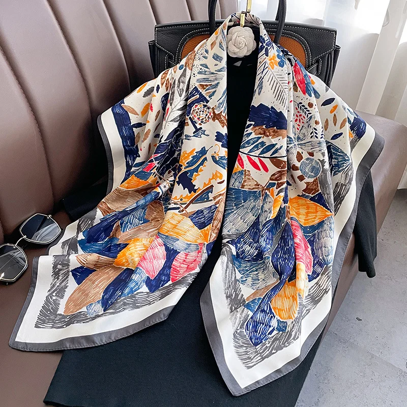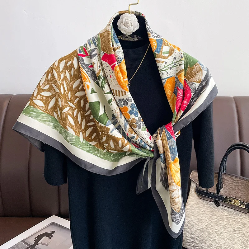 Twill Silk Scarf Women 90cm Square Hijab Shawls And Wraps Female Foulard Headkerchief Elegant Floral Summer Autumn Lady Bandana
