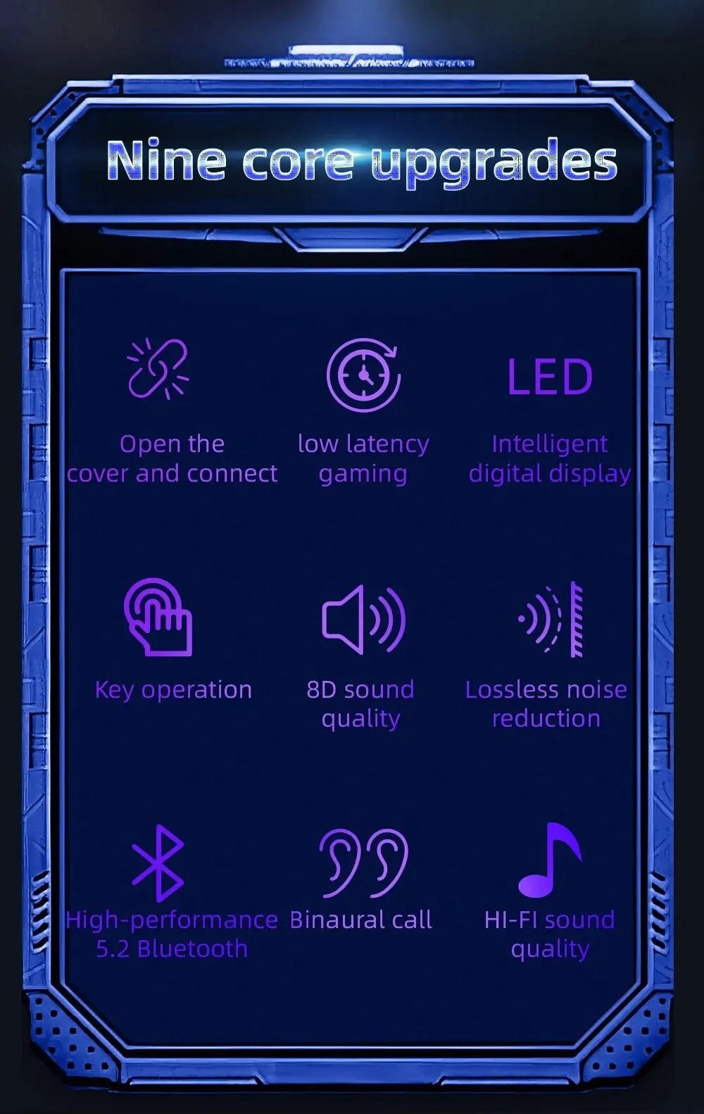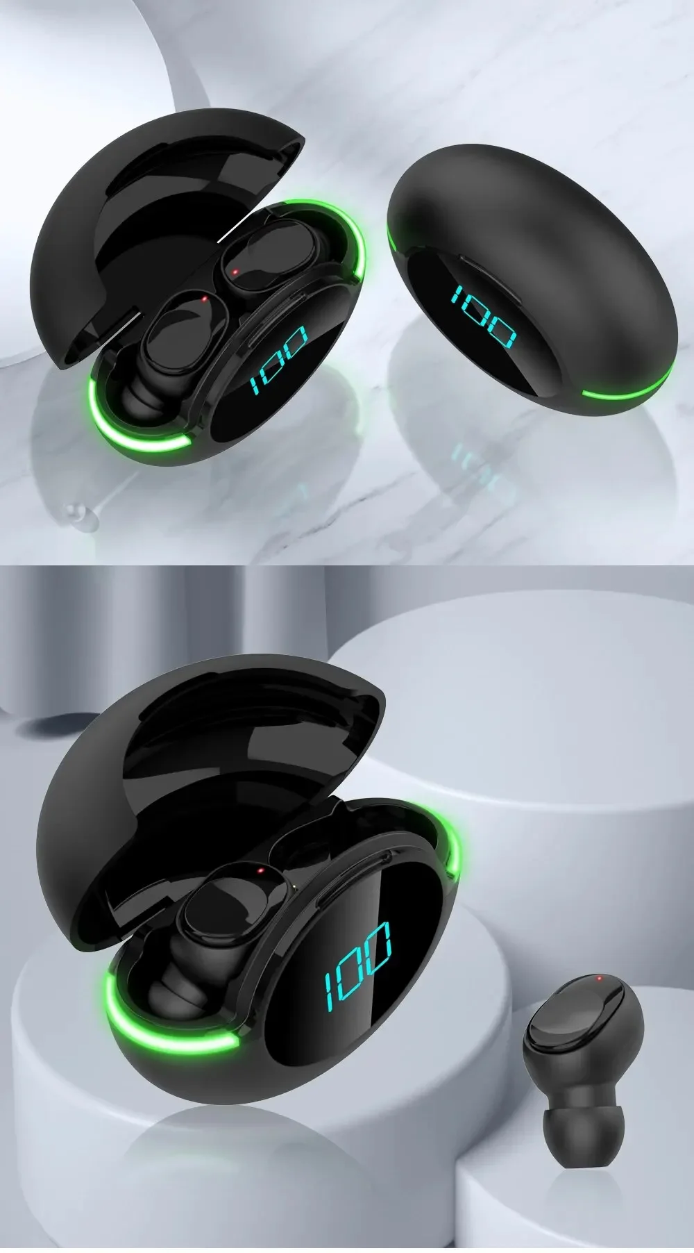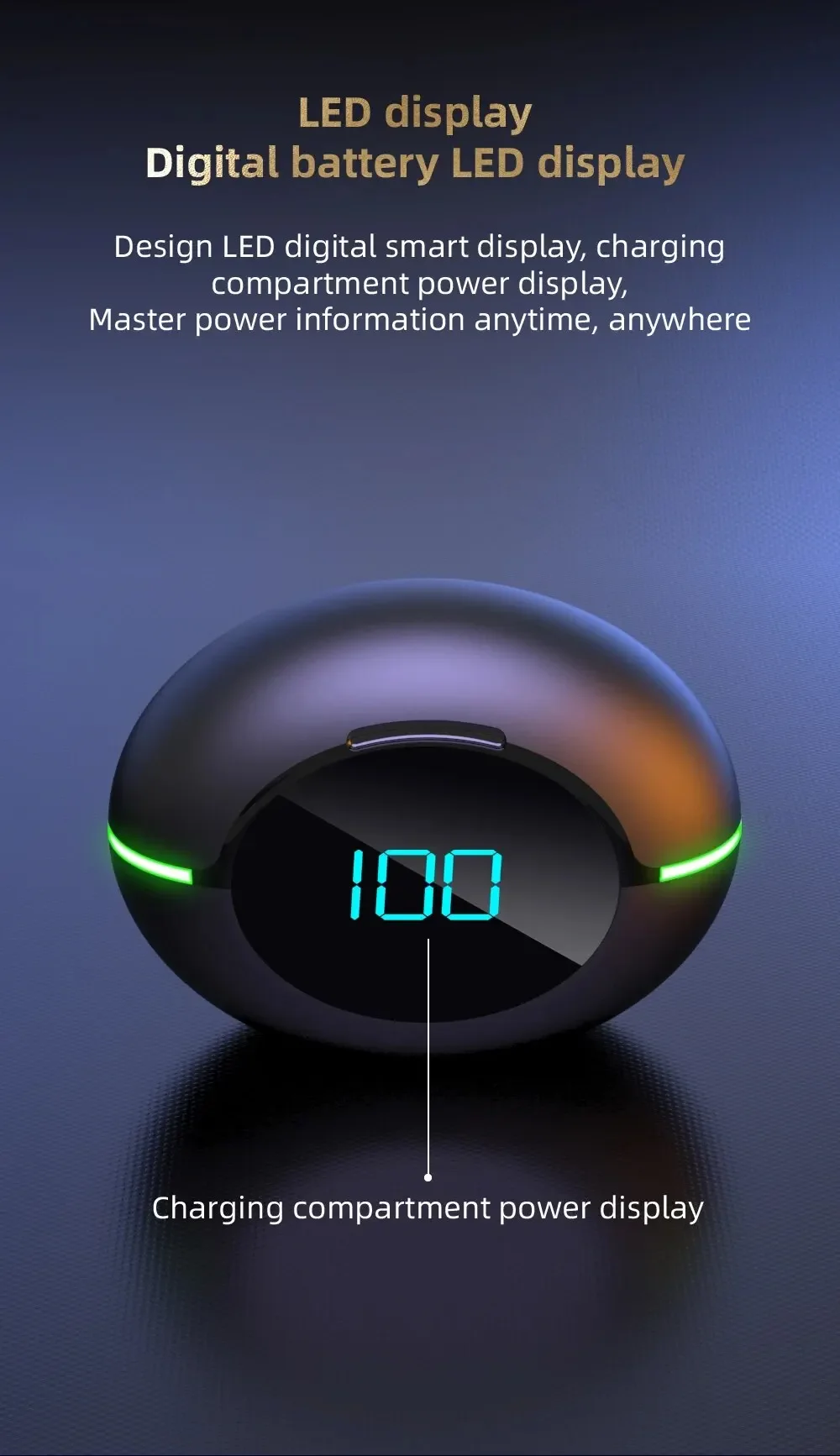 Main Feature:1. True wireless, two-ear call,2. Smart battery display,3, Wireless charging function,4, fashionable breathing lamp