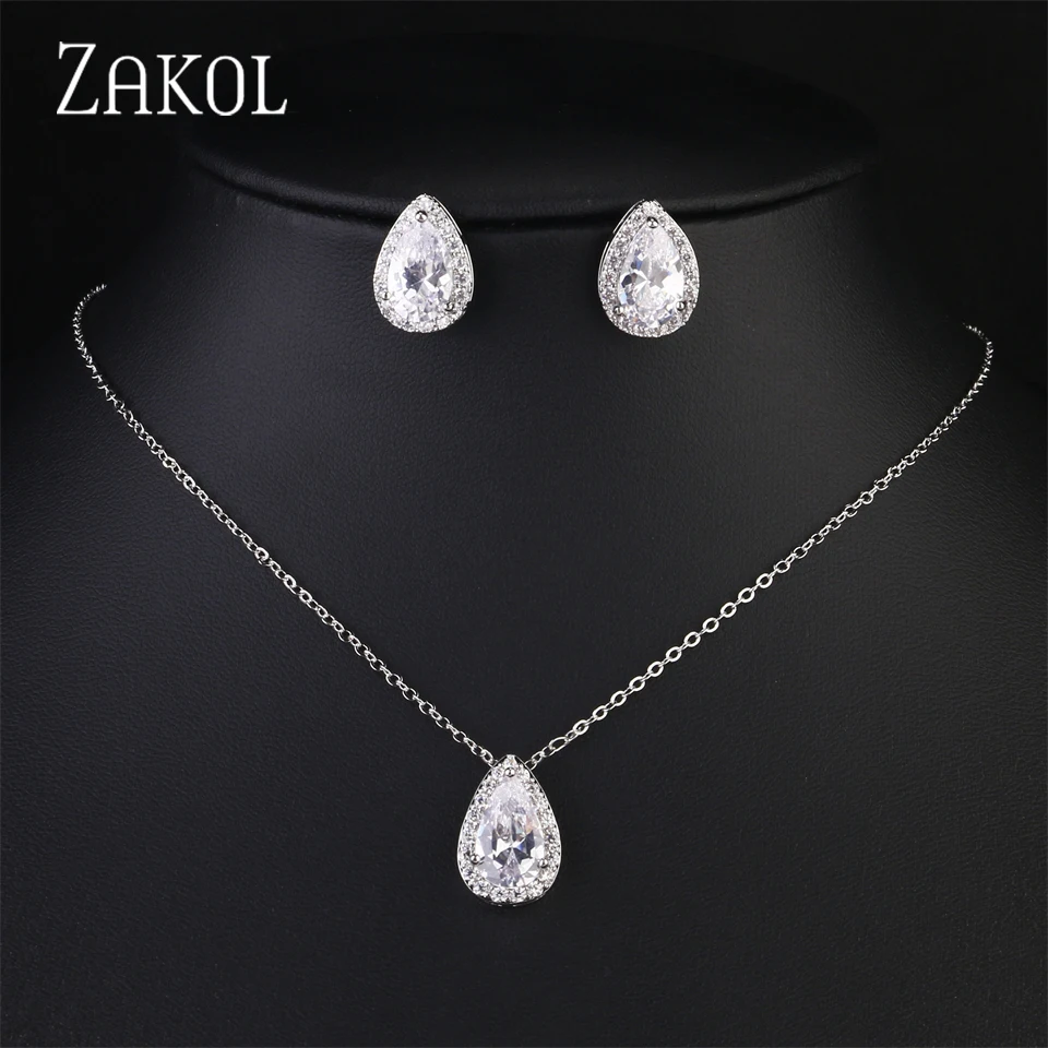 ZAKOL Classic Water Drop Zirconia Wedding Jewelry Set for Women Shiny AAA Cubic Zircon Earrings Necklace Jewelry Sets Gift