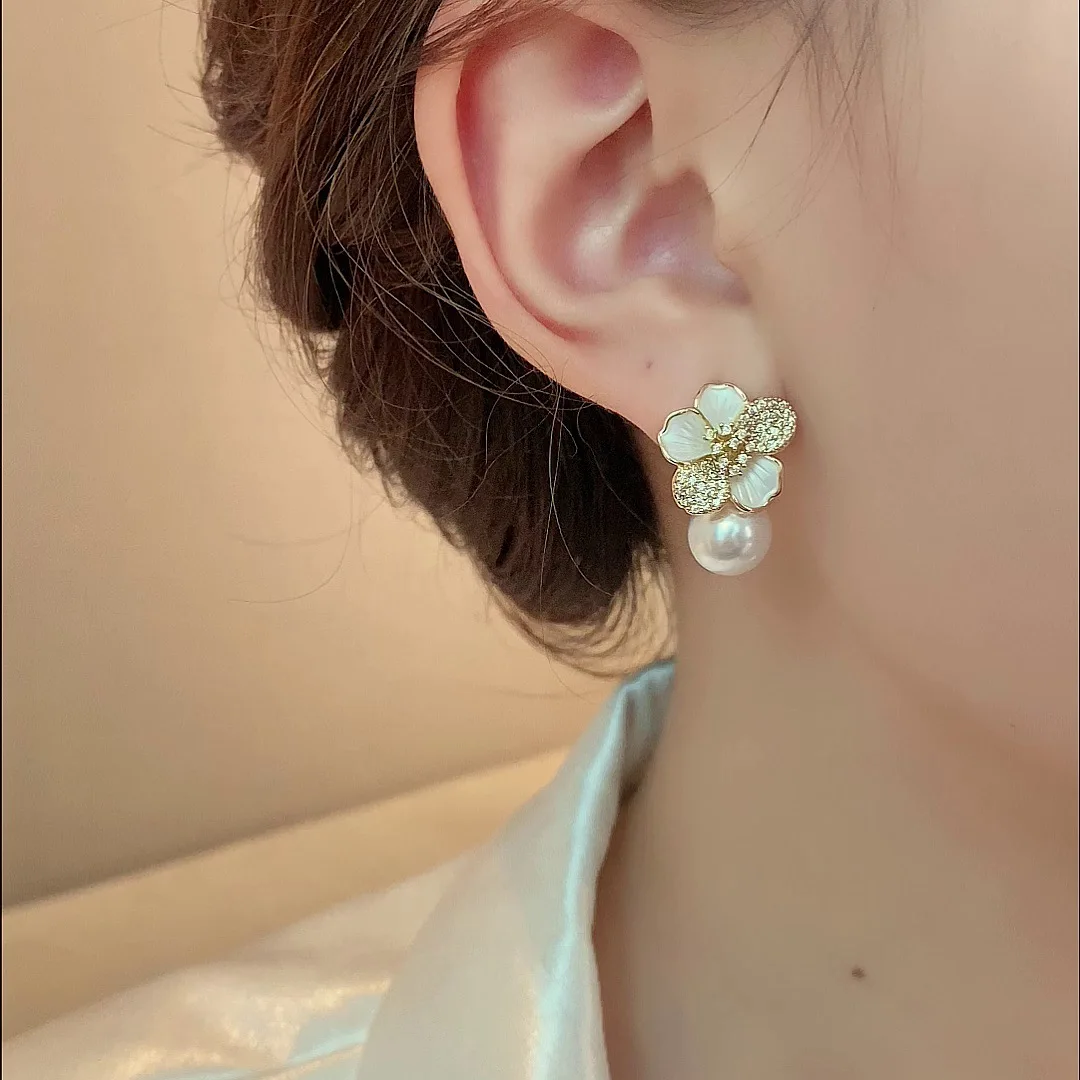 ZAKOL Luxury Micro Set Zircon White Enamel Camellia Pearl Pendant Earrings for Women Exquisite Party Ear Accessories