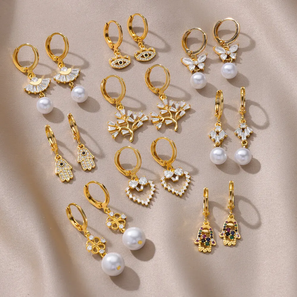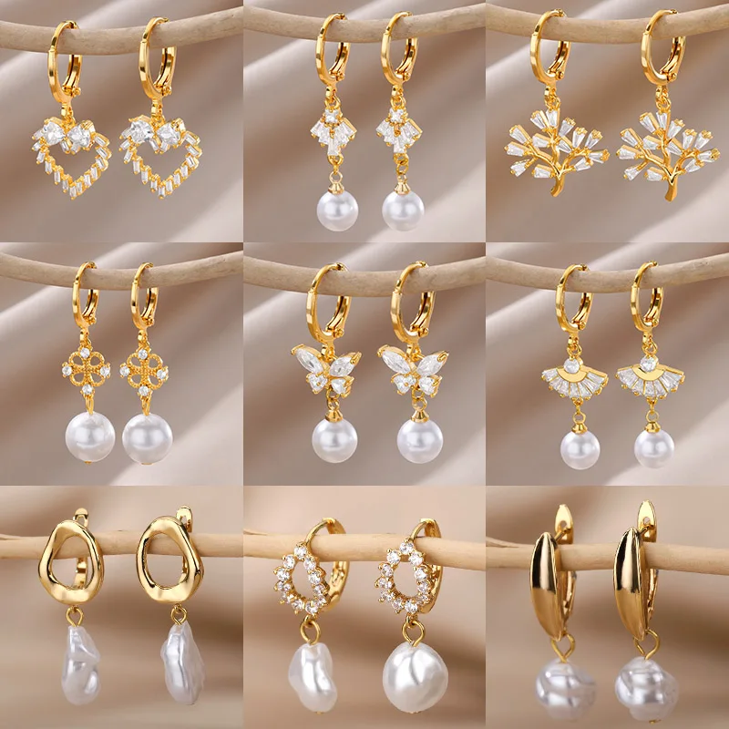 White Zircon Butterfly Pearl Earrings For Women Gold Plated Geometric Piercing Hoop Heart Earring Wedding Aesthetic Jewelry Gift